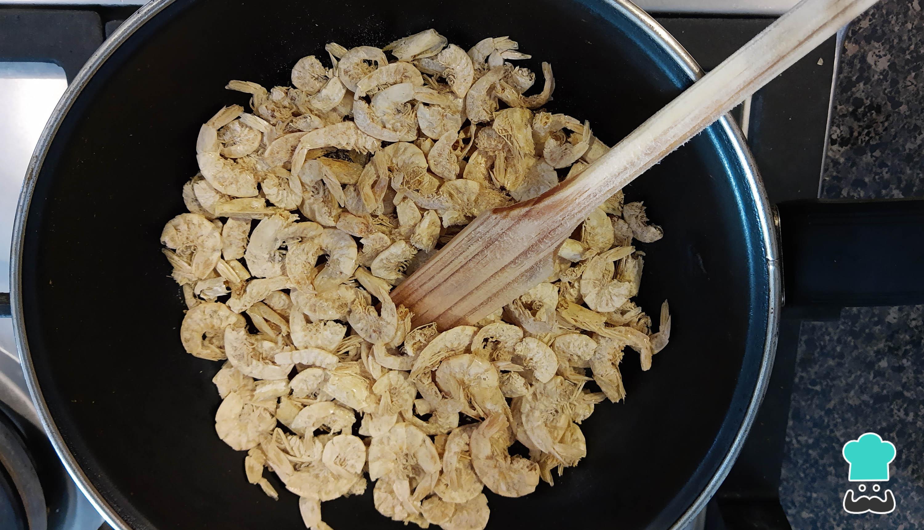 Para las tortitas de camarón, limpia el camarón seco quitando los ojos y los bigotes, después tuéstalos en una sartén por 5 minutos y mueve constantemente para evitar que se quemen, ya que si se queman puede amargar la tortita.