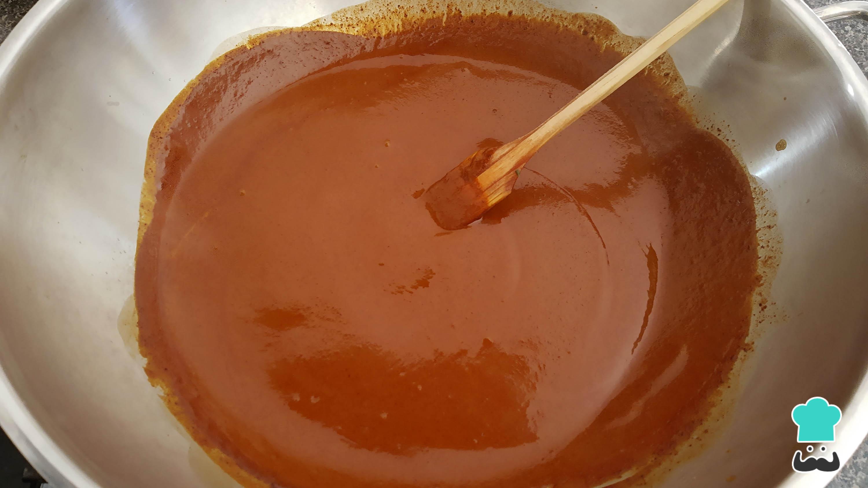 Ahora, prepara la pasta de mole poblano. Para ello, disuélvela con agua o caldo de pollo hasta logar una textura suave y ligera, o si lo prefieres puedes revisar nuestra receta de mole poblano para que aprendas a prepararlo desde cero.