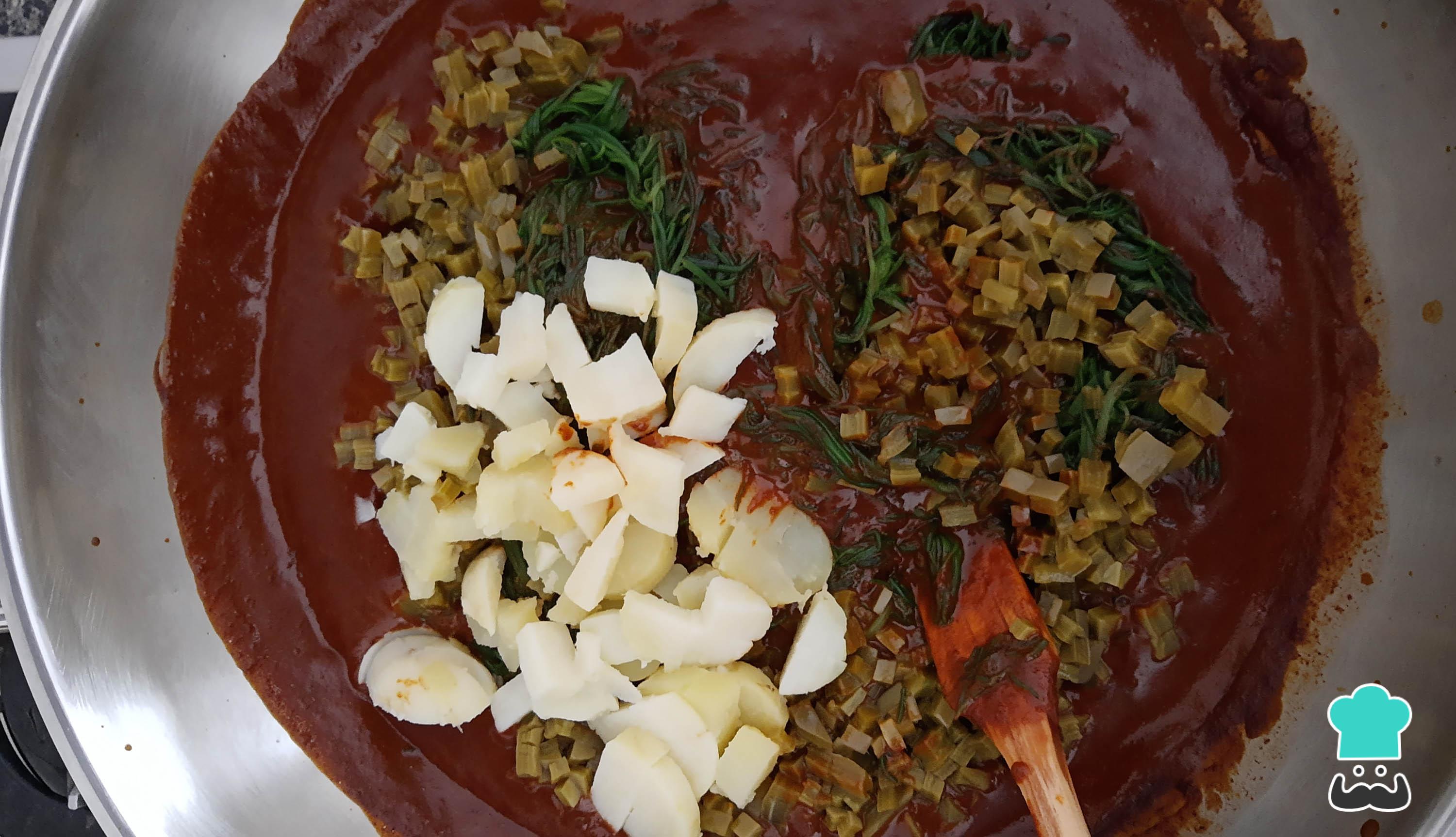 Cuando tengas tu mole poblano, agrega el nopal cocido, los romeritos y la papa cocida y picada en cuadritos.