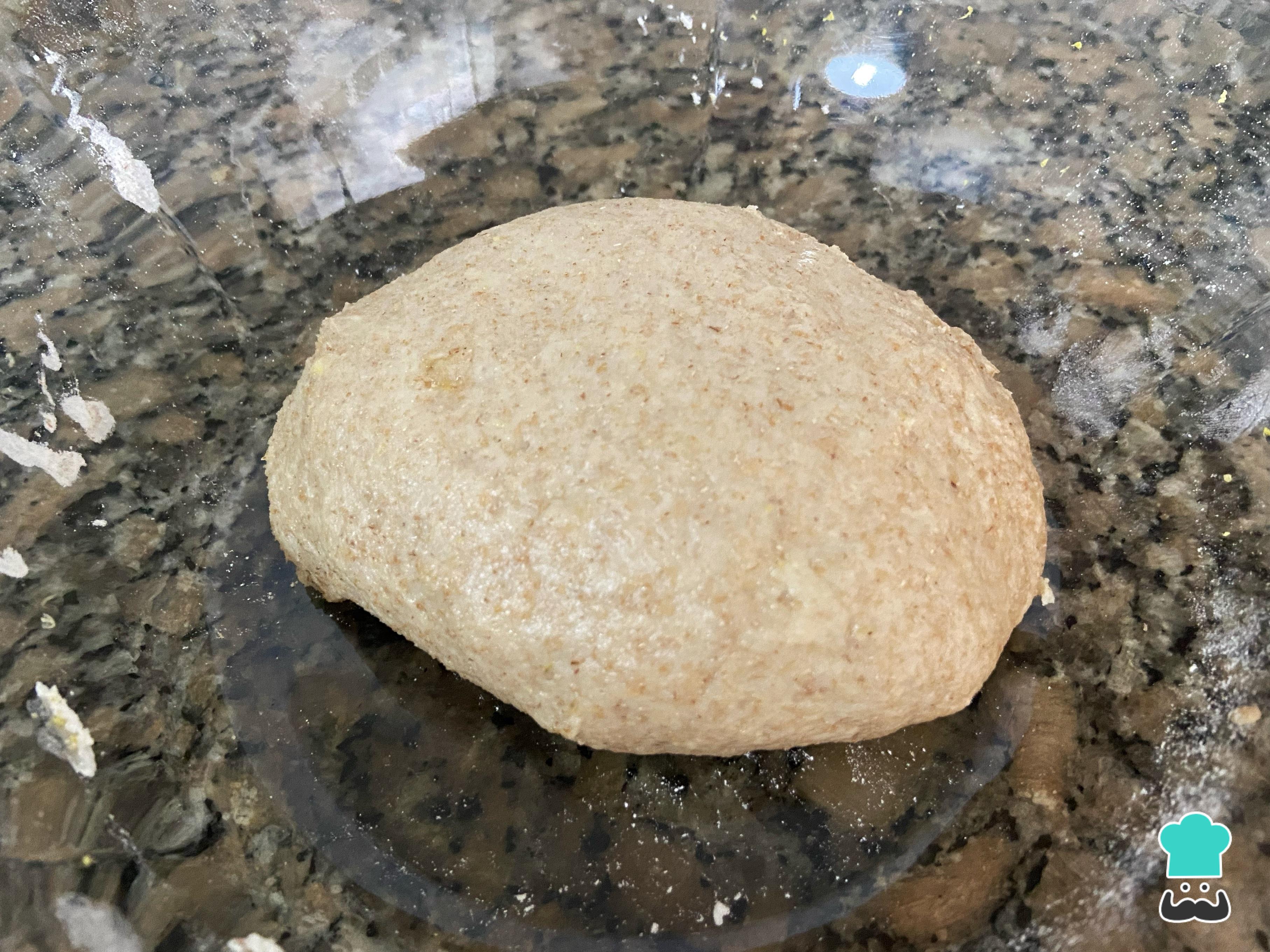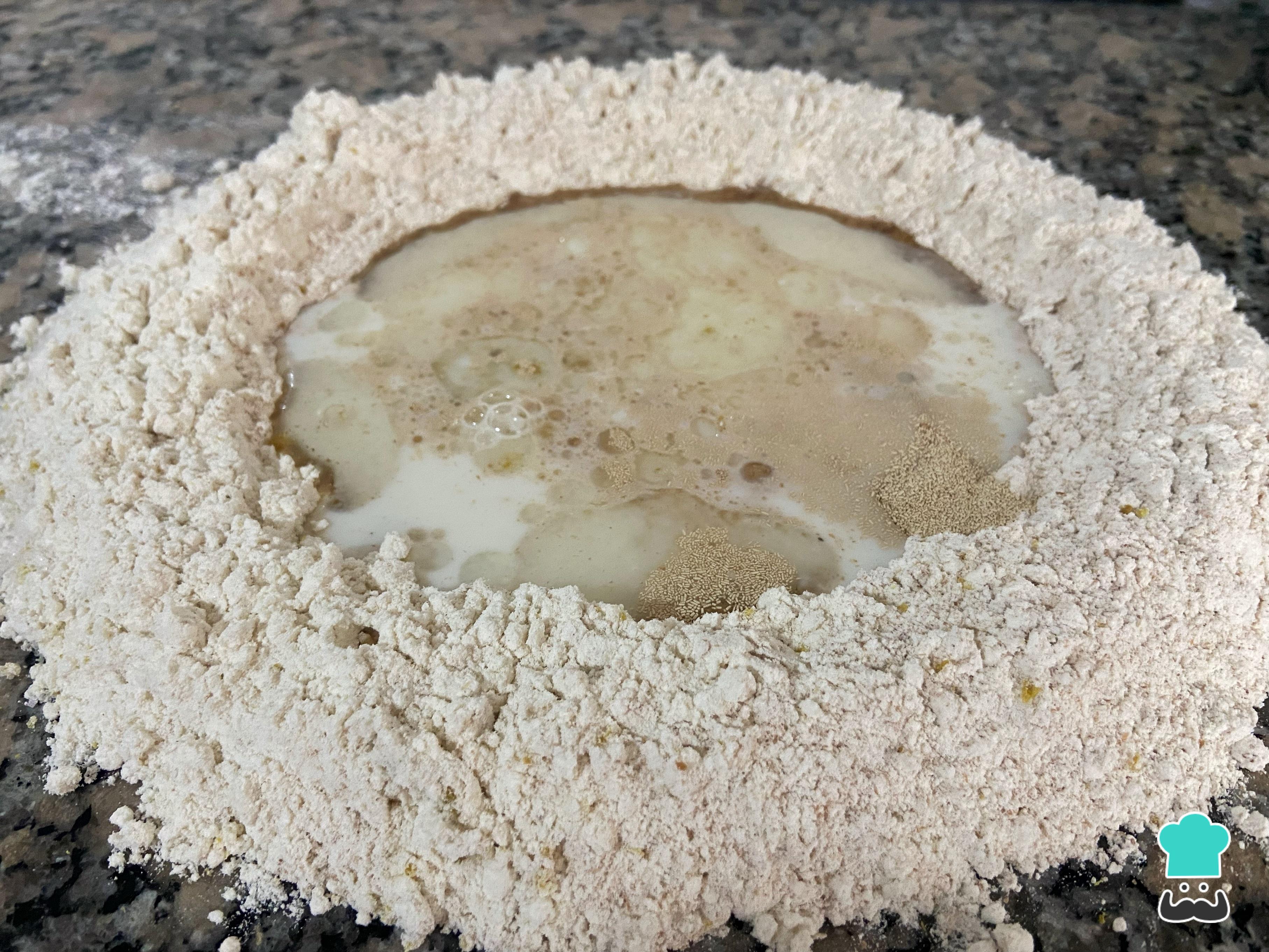 Integra los ingredientes del interior hacia afuera y amasa hasta lograr un bollo, ayúdate con un cornet si es necesario. Ten en cuenta que la masa debe quedar algo húmeda para que la rosca también lo esté. Tapa y deja reposar en un lugar cálido hasta que duplique su volumen.