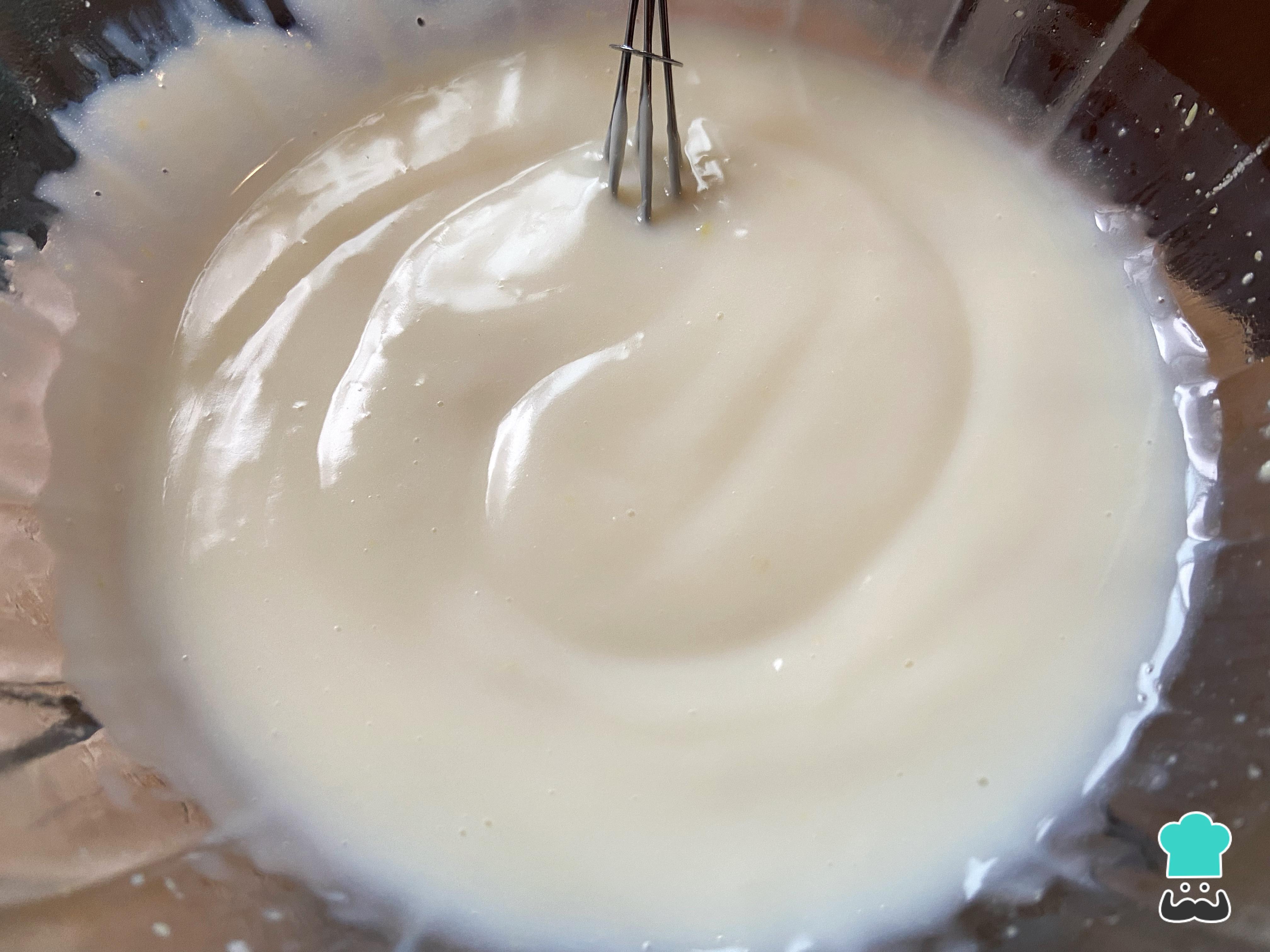 Condimenta la crema con la ralladura de cítrico, el azúcar, la esencia de vainilla y la cúrcuma. Esta última la añadimos únicamente para imitar el color de la pastelera clásica, hecha con yema de huevo. Pruébala y, si te gusta, tápala con un papel film o separador que quede en contacto con la crema para que no se seque mientras se enfría. Resérvala.