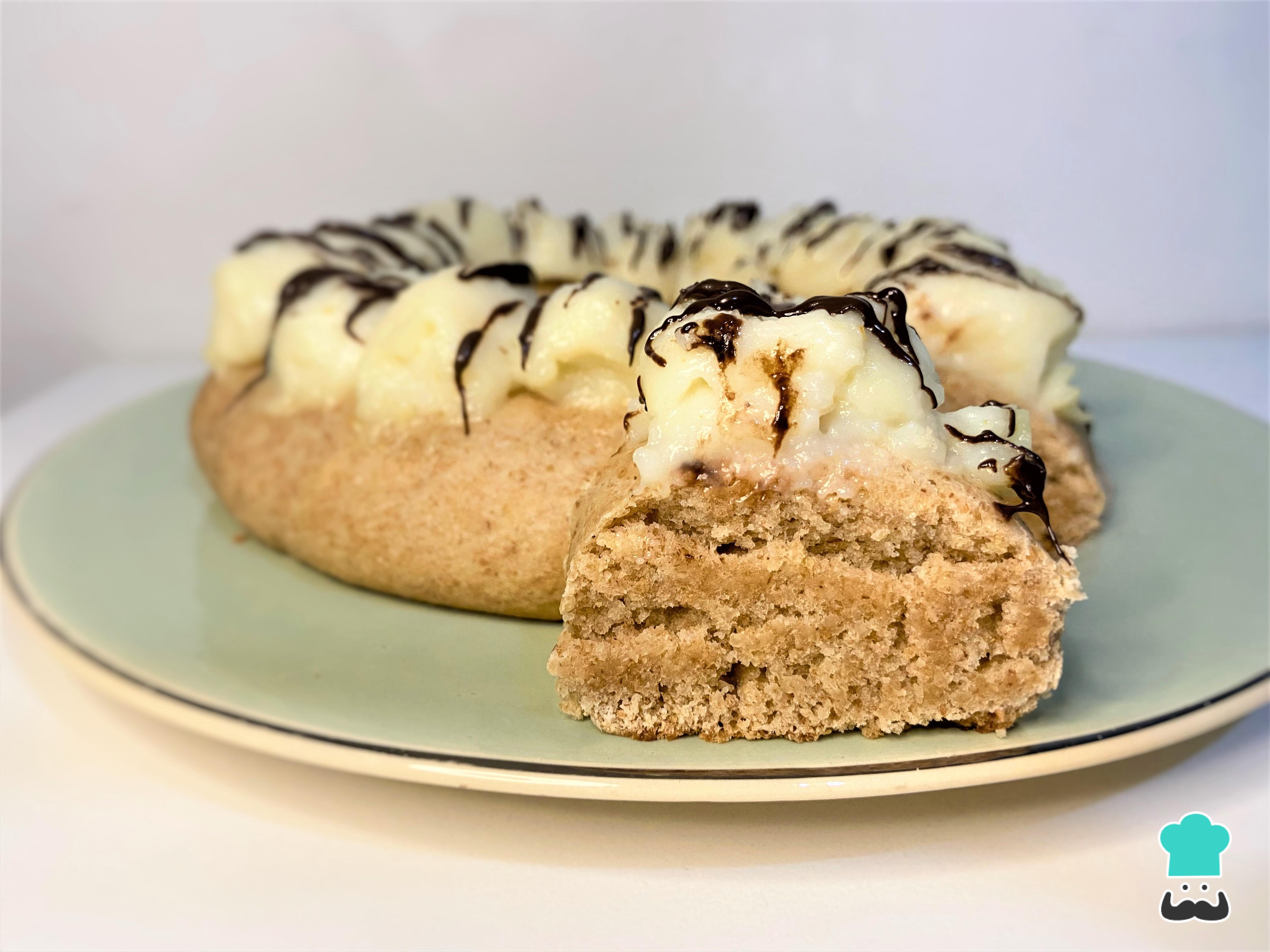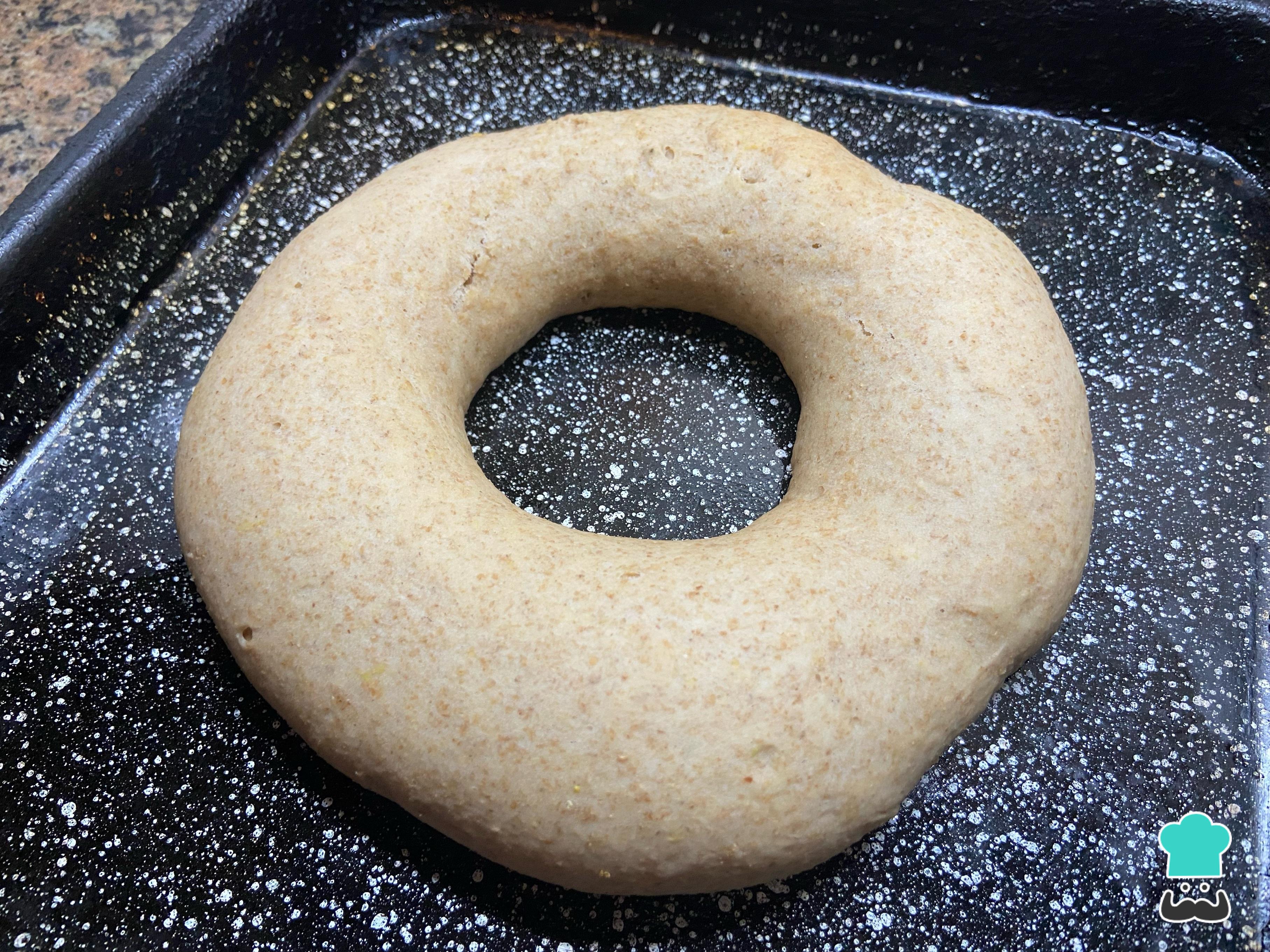 Cuando tu bollo esté listo, desgasifícalo y dale la forma de rosca sobre una placa engrasada. Tápalo y déjalo leudar nuevamente unos 30-40 minutos. A continuación, enciende el horno a 180 ºC. Pasado ese tiempo, cocínalo en el horno precalentado aproximadamente 15 minutos.