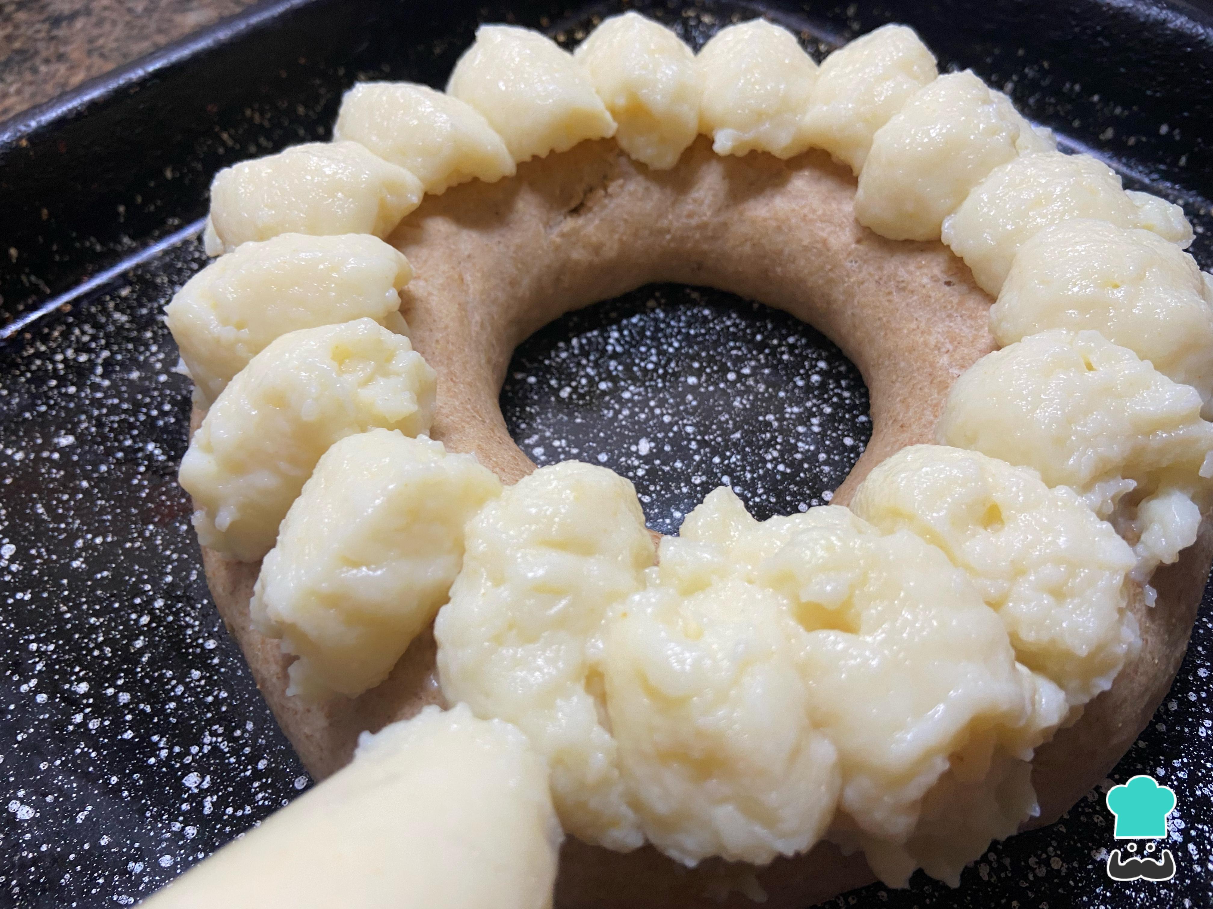Cuando hayan pasado los primeros 15 minutos de cocción de la rosca de Pascua vegana, retírala, agrega la crema pastelera y cocina otros 5-7 minutos más. Debes pincharlo con un cuchillo o palillo, no deben quedar restos de la preparación.