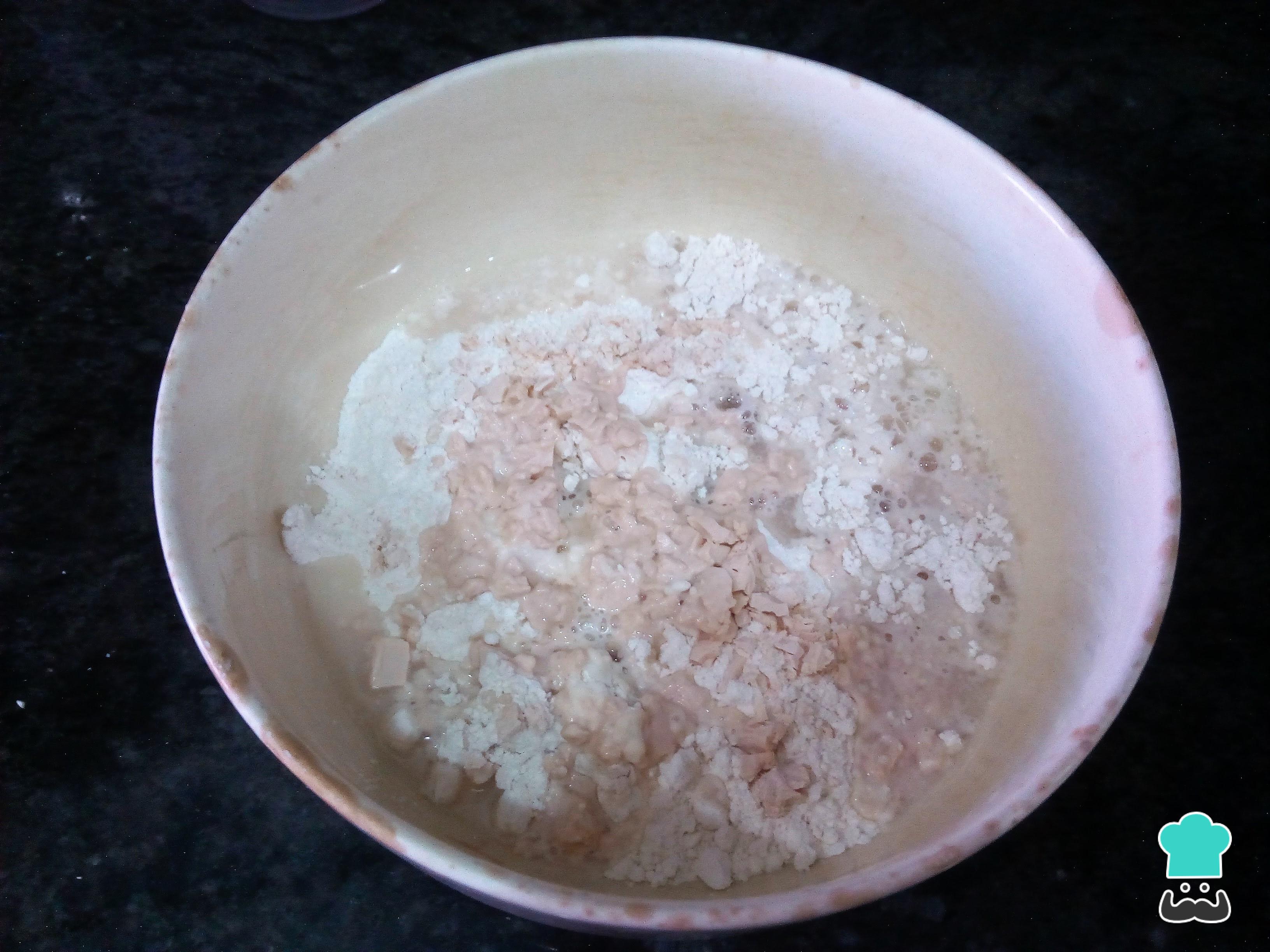 Disuelve la levadura en la leche vegetal tibia o a temperatura ambiente como primer paso para elaborar esta esponjosa rosca de Reyes vegana.