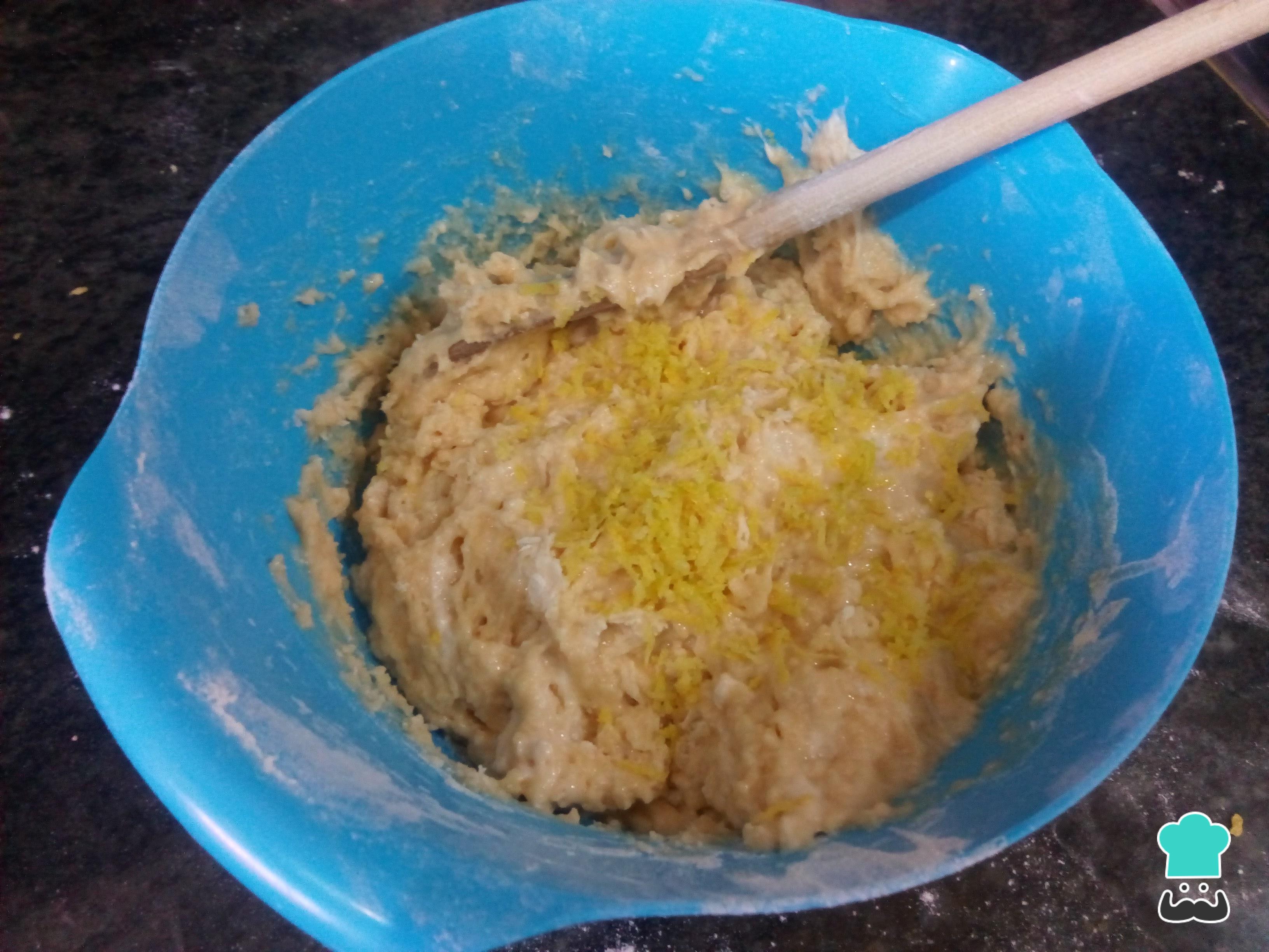 Cuando la masa madre del roscón de Reyes para veganos haya fermentado, en otro bol mezcla el resto de la harina con el azúcar blanco, el azúcar moreno, la maicena, la margarina y la sal. Una vez tengas esta masa, incorpora la masa madre poco a poco y añade las gotas de agua de azahar o la esencia de anís, y las ralladuras de limón y naranja.