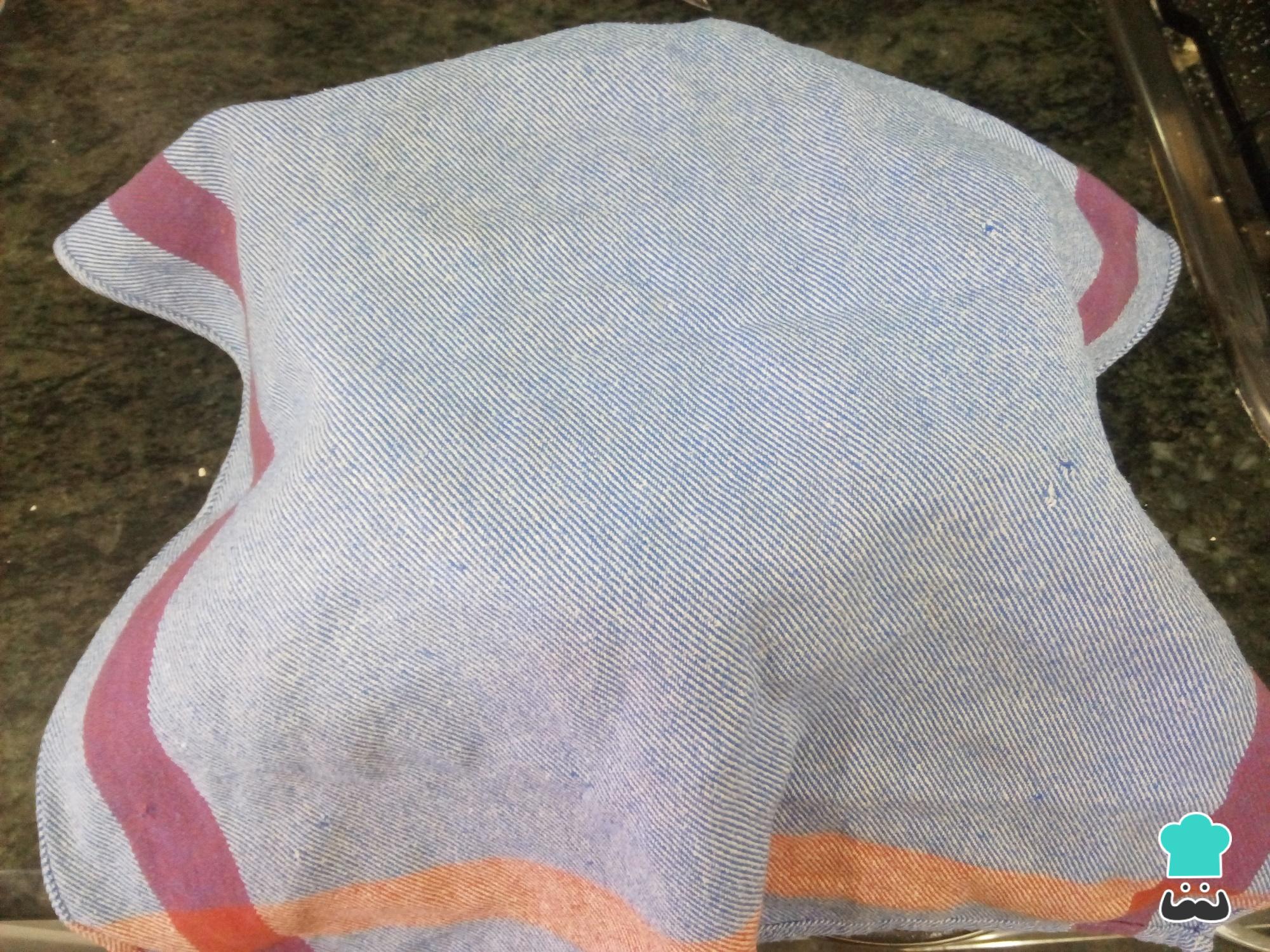 Posteriormente coloca el roscón vegano fácil encima de una bandeja con papel de horno o forrada con aceite y harina para que luego no se pegue, y déjalo fermentar 1 hora más tapado con un paño húmedo para que no se seque.