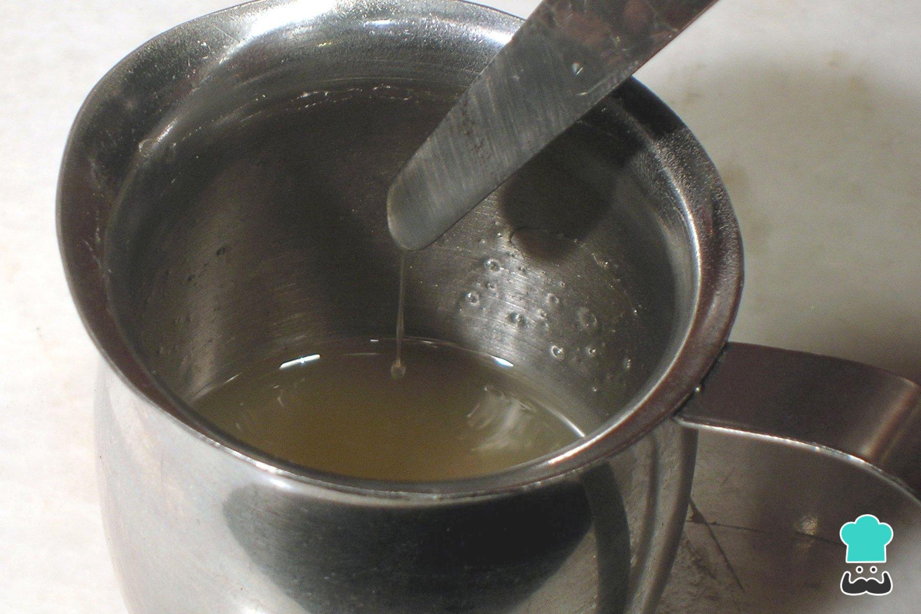 Mientras tanto, hacemos el almíbar. Coloca el agua y el azúcar en una olla hasta llevar a ebullición a fuego medio para que se disuelva el azúcar. Una vez disuelto déjalo enfriar para usarlo más tarde.