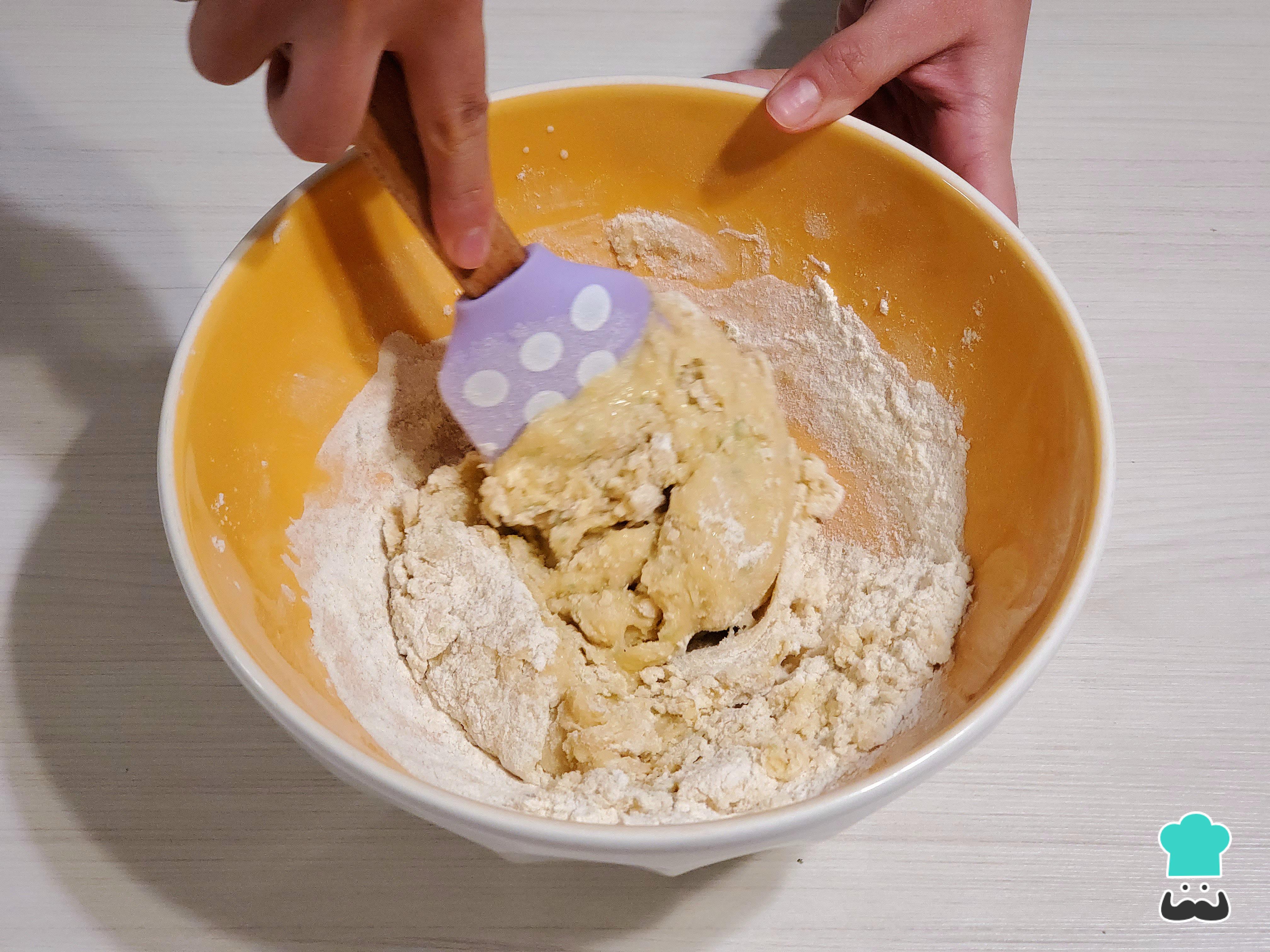 Incorpora los ingredientes secos, que son la harina y el polvo de hornear. Mezcla esta vez utilizando una espátula de goma.