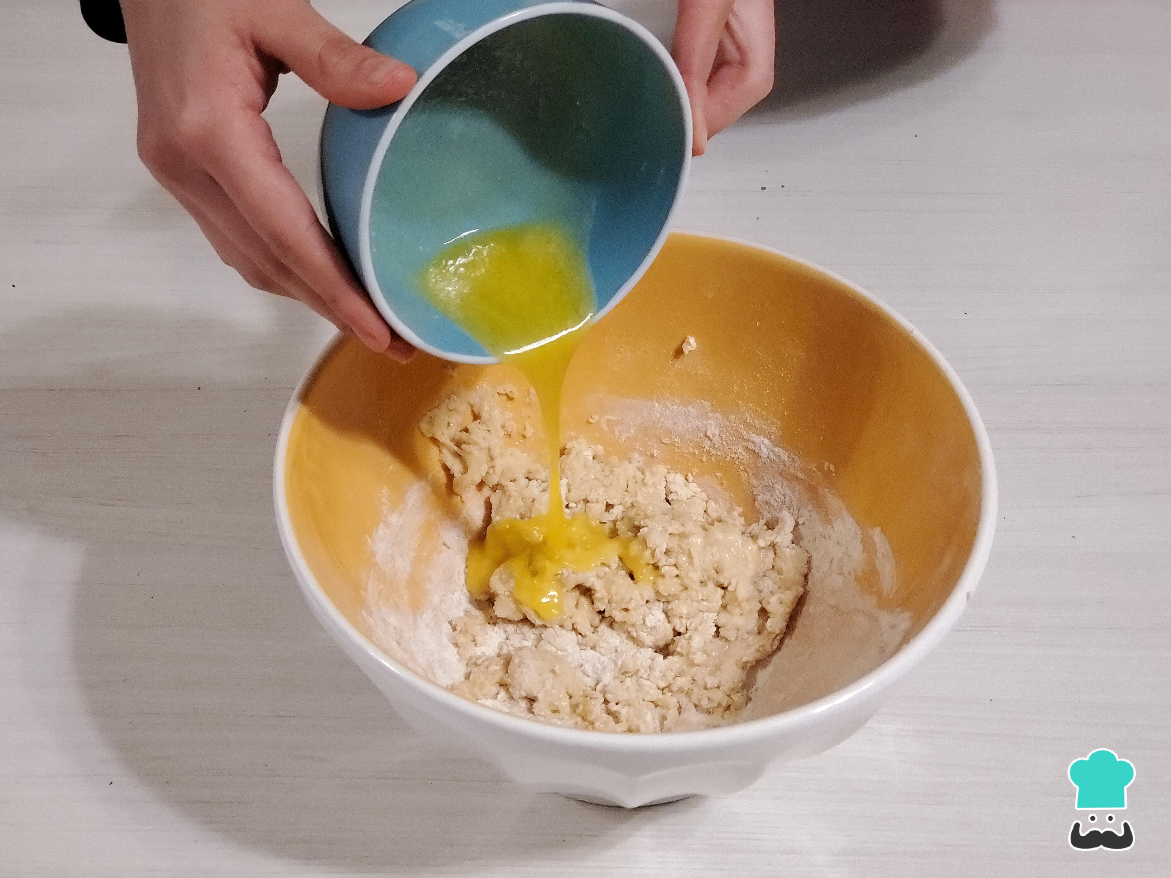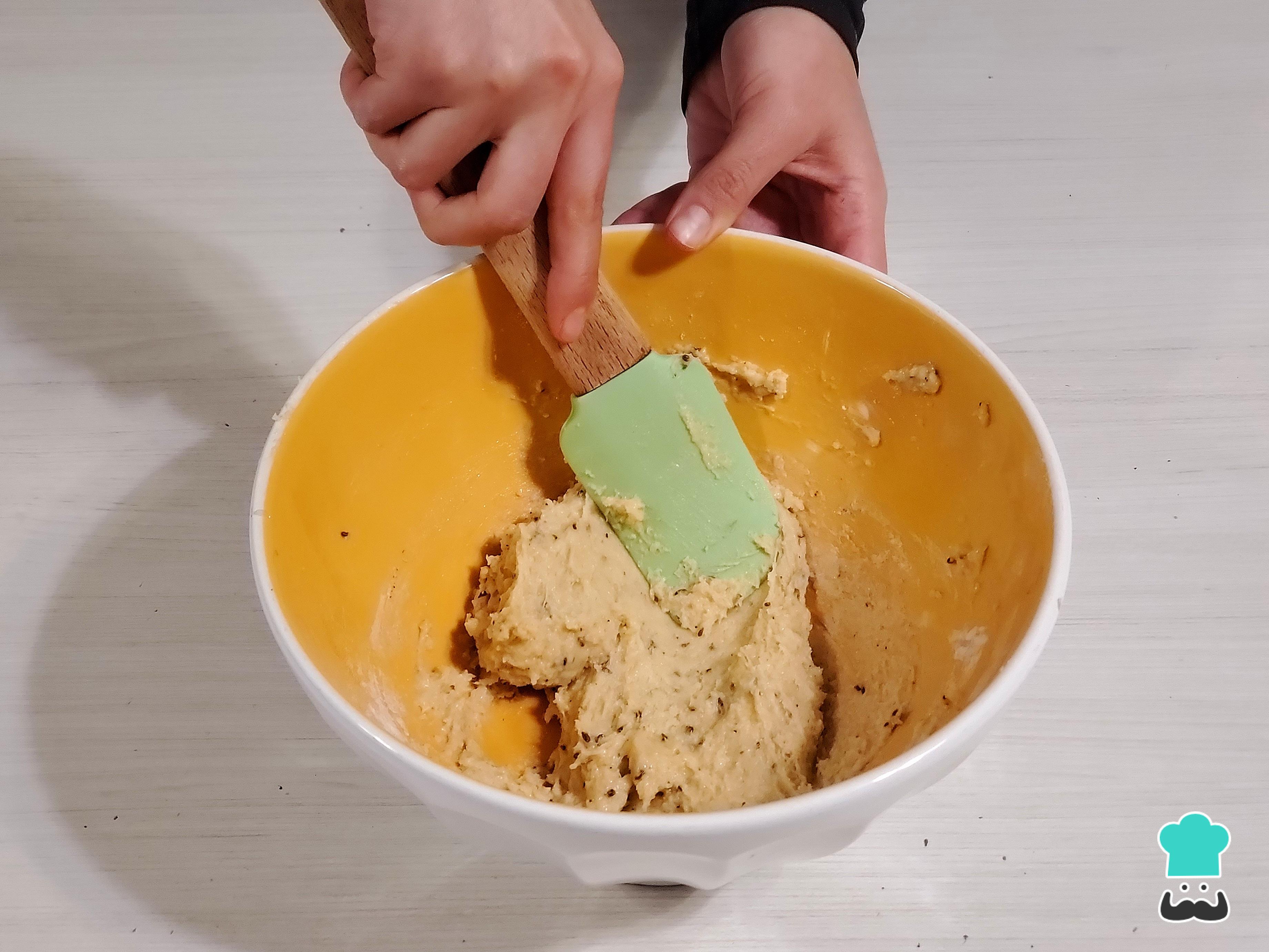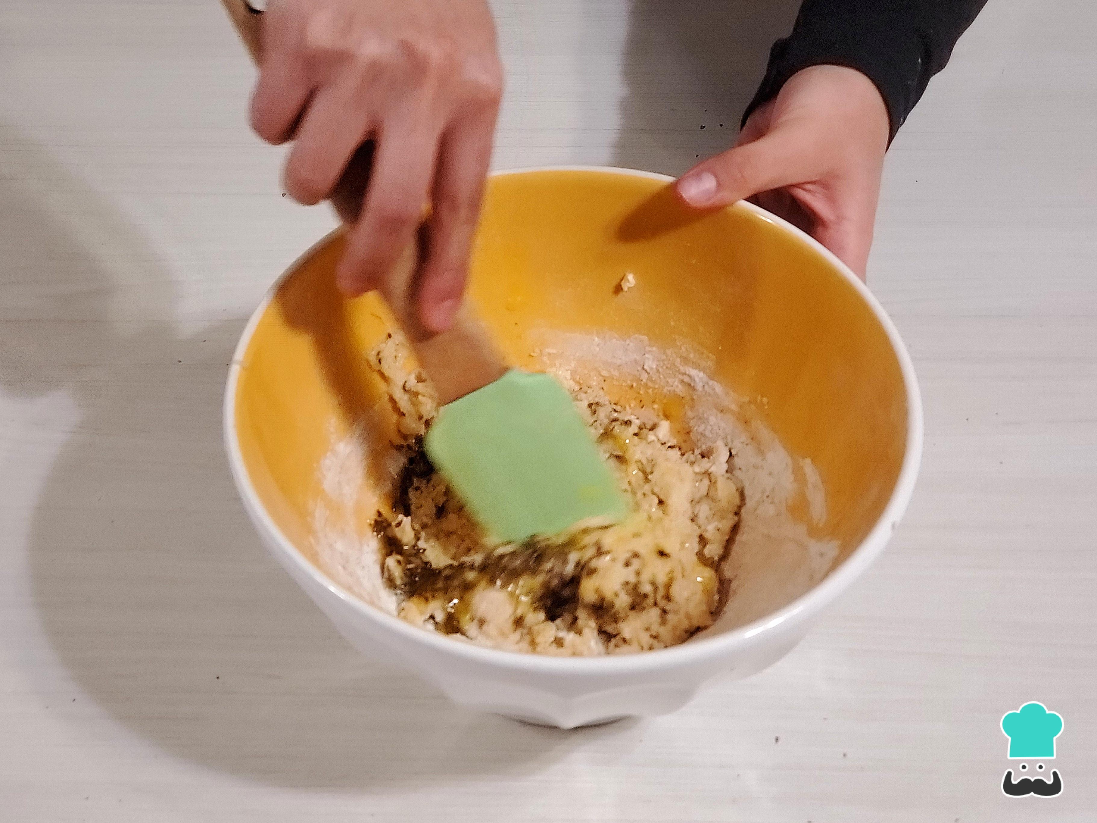 Intégralas a la masa y mezcla bien. Si deseas, utiliza las manos para obtener una masa homogénea de textura densa y chiclosa. Solo asegúrate de no sobreamasar para evitar que se desarrolle el gluten y queden unas rosquillas caseras duras.