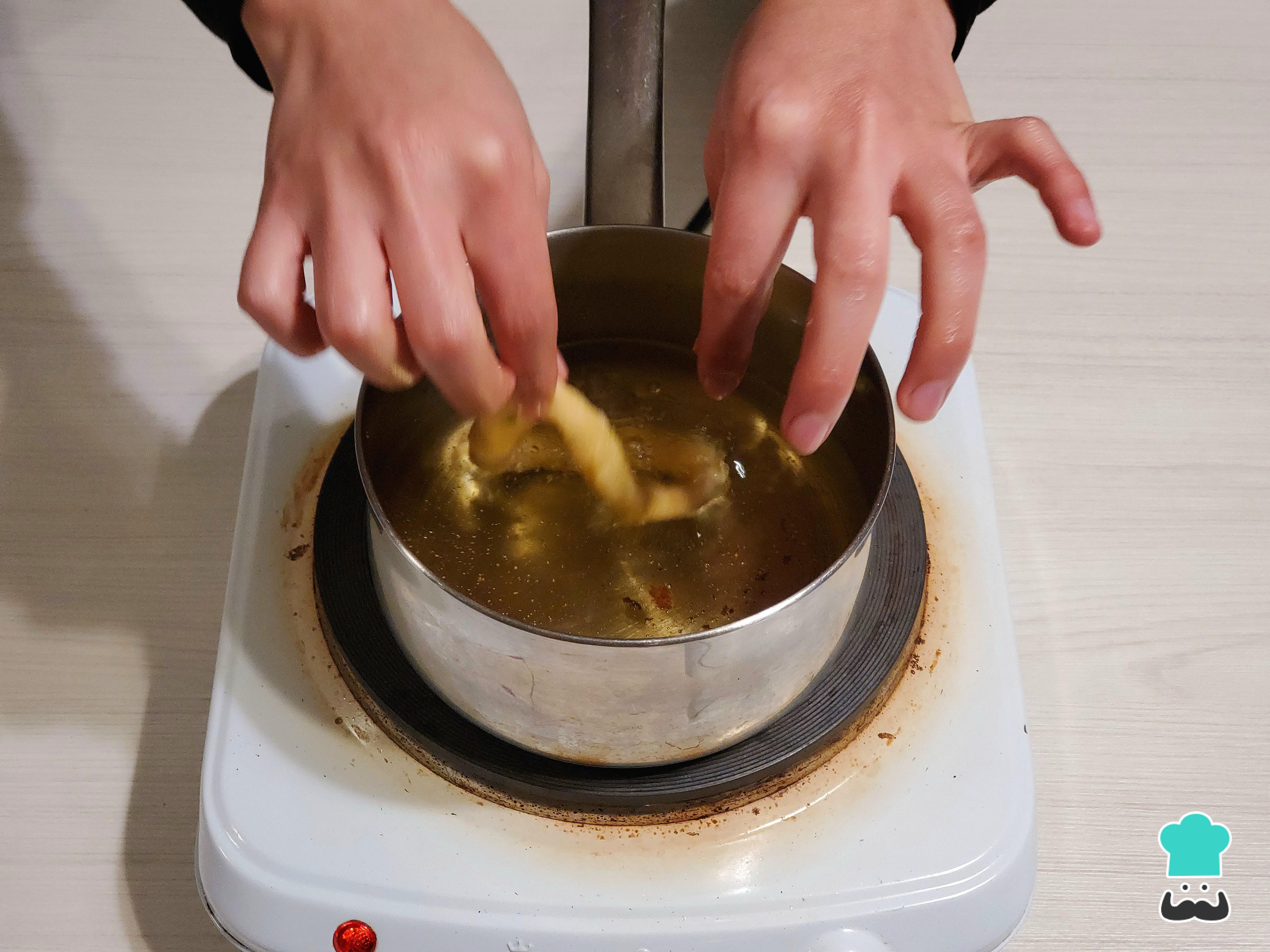 Inmediatamente sumérgelas en una olla con abundante aceite para freírlas. La temperatura ideal del aceite debe estar entre 160 °C y 170 °C. Después de un par de minutos, dales vuelta a las rosquitas para que se doren uniformemente.