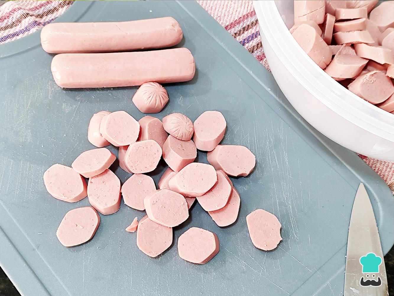 Empieza la receta por cortar las salchichas en rodajas sesgadas o a la mitad si utilizas salchichas cocteleras, reserva mientras continuas con la preparación.