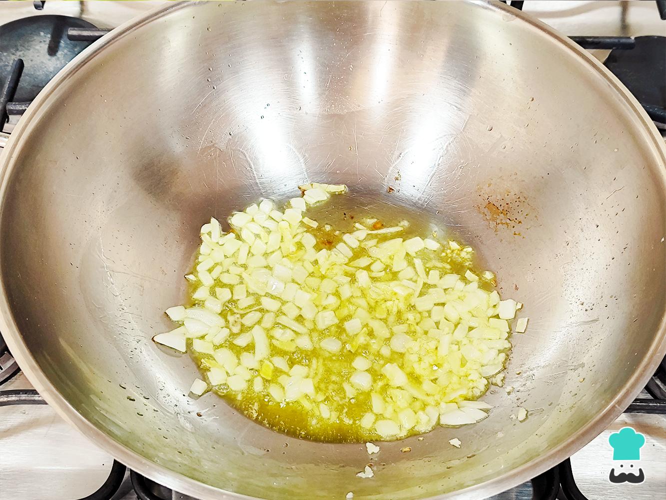 Calienta el aceite y la mantequilla en una sartén u olla grande. Luego, añade la cebolla y los ajos picados, sofríe y remueve constantemente hasta que se doren sin quemar.