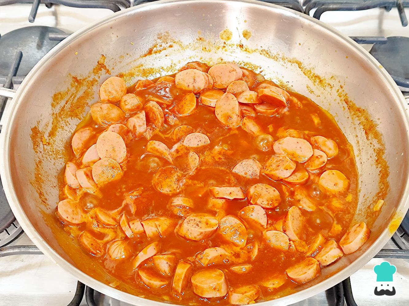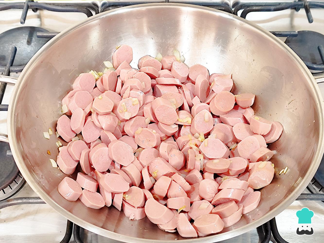 Agrega las salchichas y fríelas durante 3 a 5 minutos hasta que se doren ligeramente por fuera, remueve constantemente para evitar que se peguen o quemen.