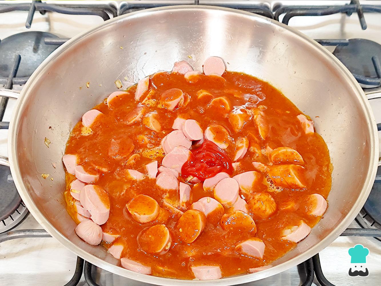 Cuando las salchichas estén doradas, vierte el puré de tomate, la salsa cátsup y el chipotle, mezcla bien para que la salsa cubra todas las salchichas.