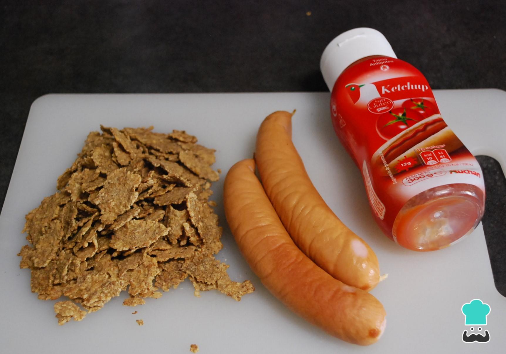 Para hacer estas divertidas salchichas crujientes, lo primero que debes hacer es alistar todos los ingredientes. Puedes usar cualquier tipo de cereal, bien sea de trigo o de maíz.