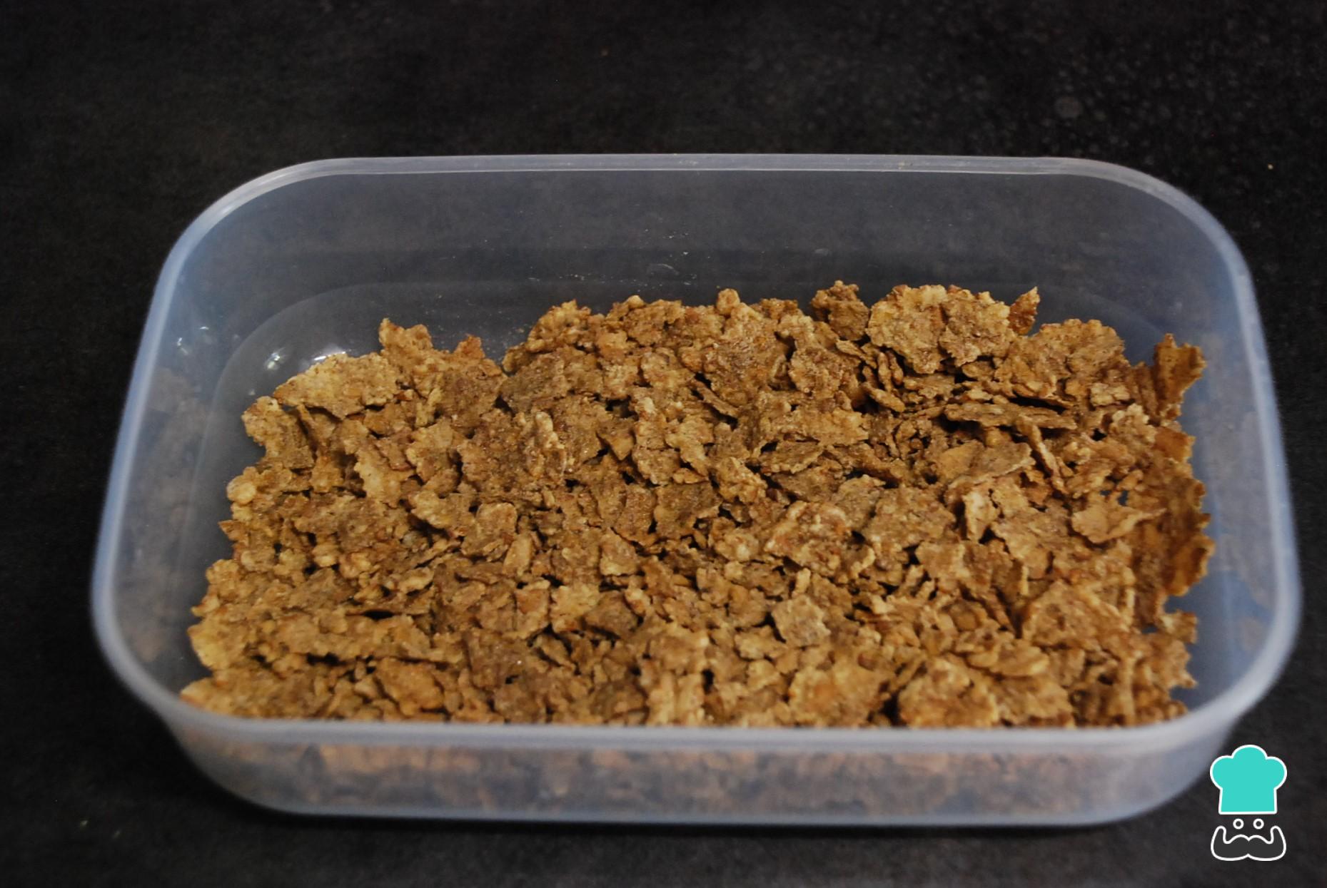 Coloca el cereal en un envase lo suficientemente grande como para rebozar las salchichas. Tritura todas las hojuelas con las manos, lo ideal es que queden bien trituradas pero no hechas polvo. Esto hará que las salchichas sean crujientes.