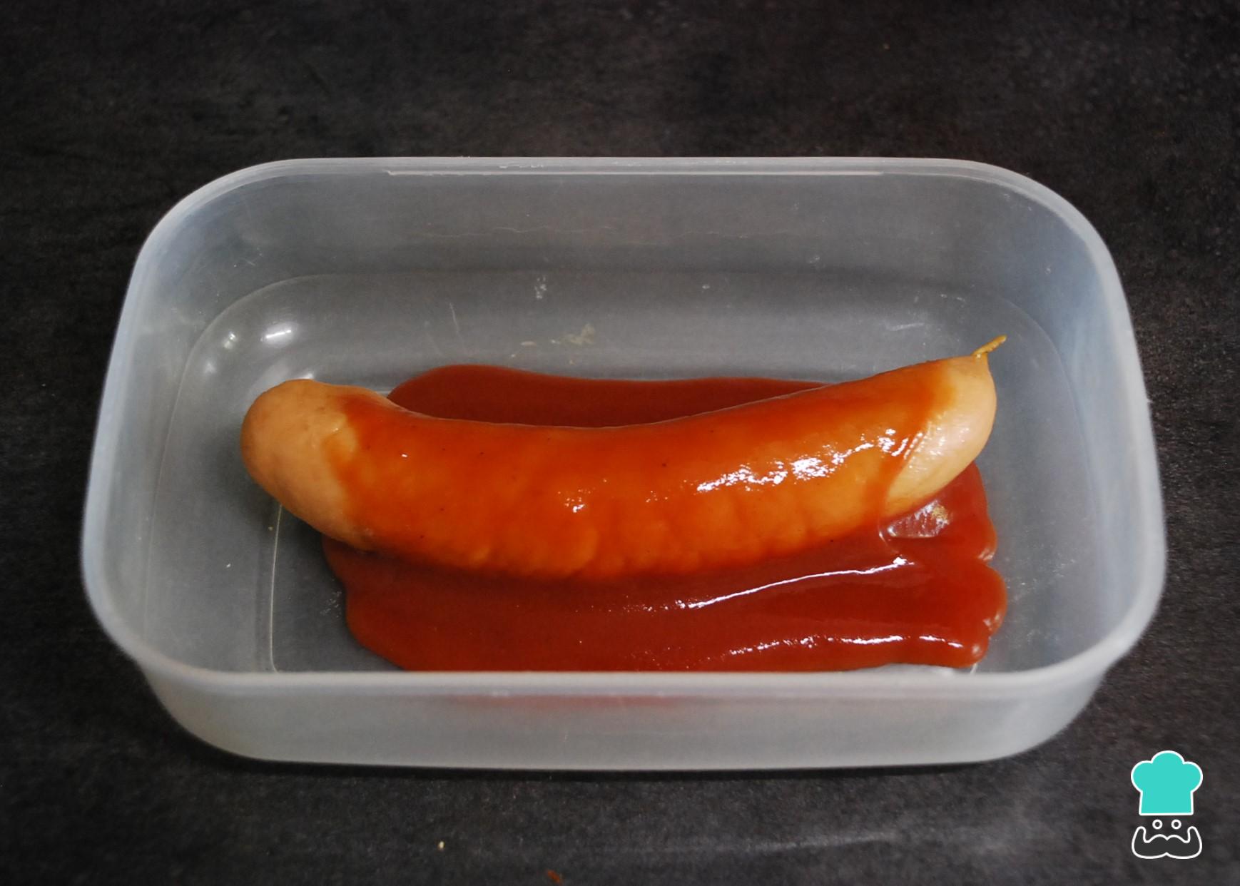 Prepara otro envase de las mismas características con la salsa de tomate. Baña las salchichas el ketchup hasta que queden bien cubiertas.