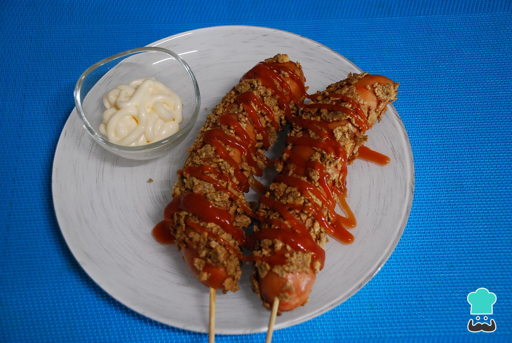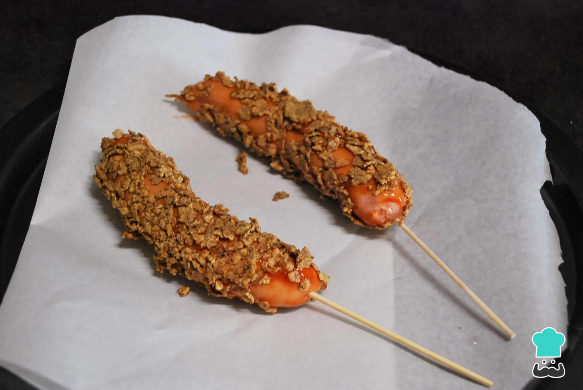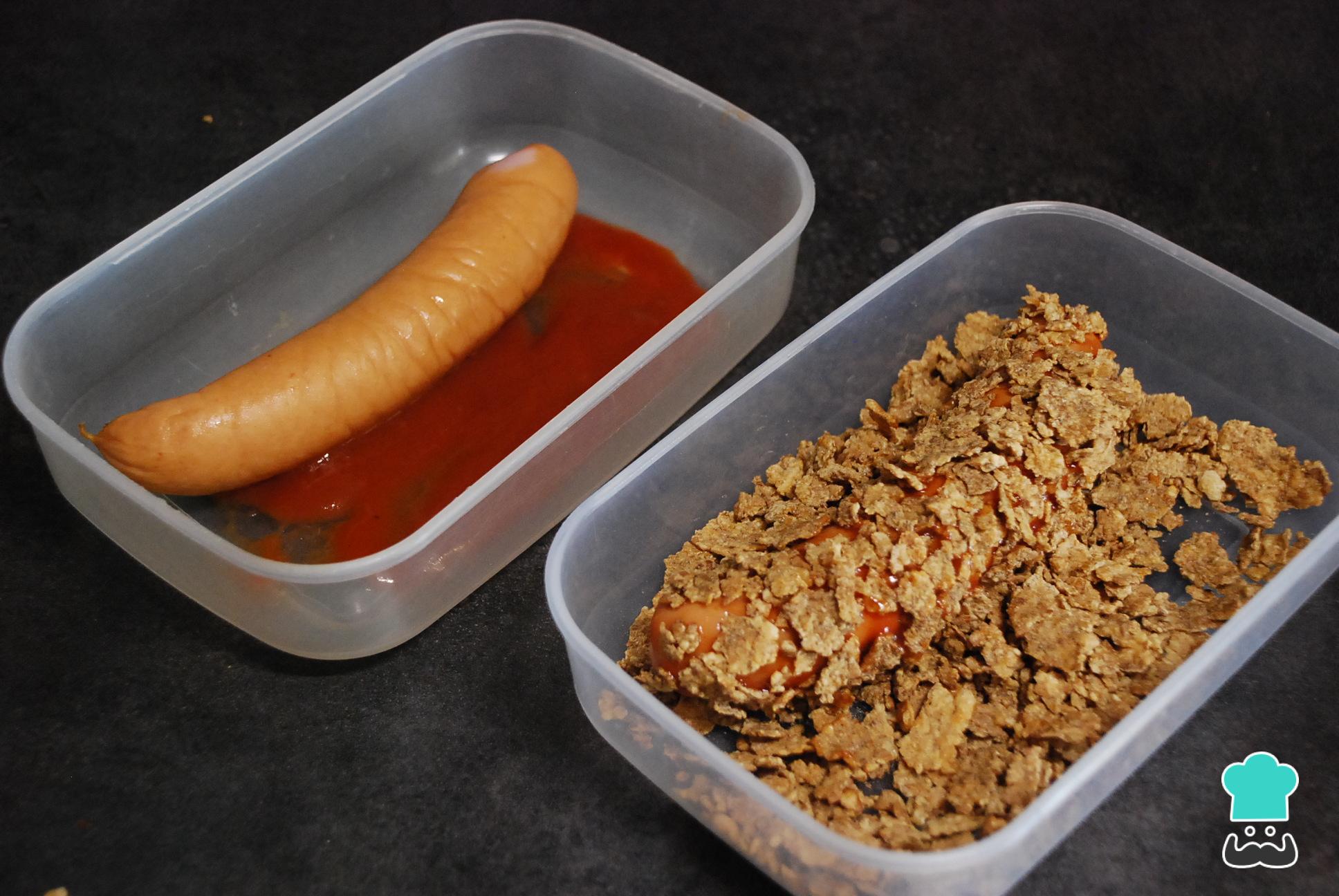 A continuación, pasa las salchichas por el cereal triturado. La idea es que con el ketchup se peguen las hojuelas en toda la salchicha.