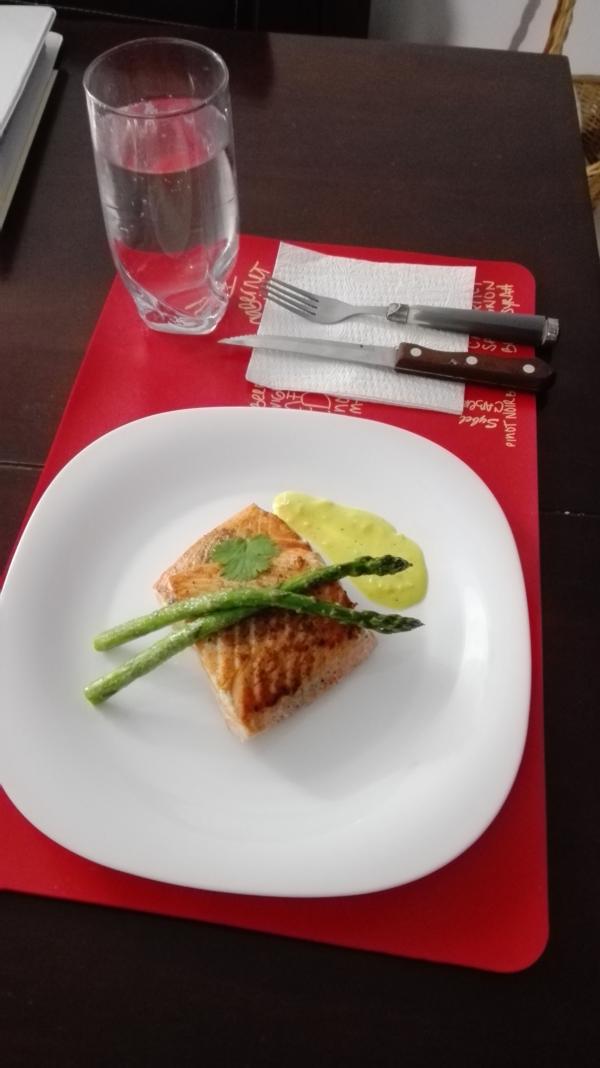 Salmón condimentando ligeramente, cocinado vuelta y vuelta para dorar ligeramente y acompañado con una espectacular salsa fría de yogur, que además podrás usar para acompañar otros platos de pescado.