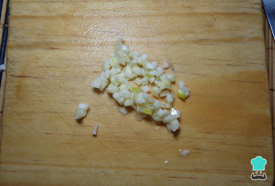 Vamos a comenzar tomando el diente de ajo y con mucho cuidado lo vamos a picar muy finamente, así como se observa en la siguiente imagen.