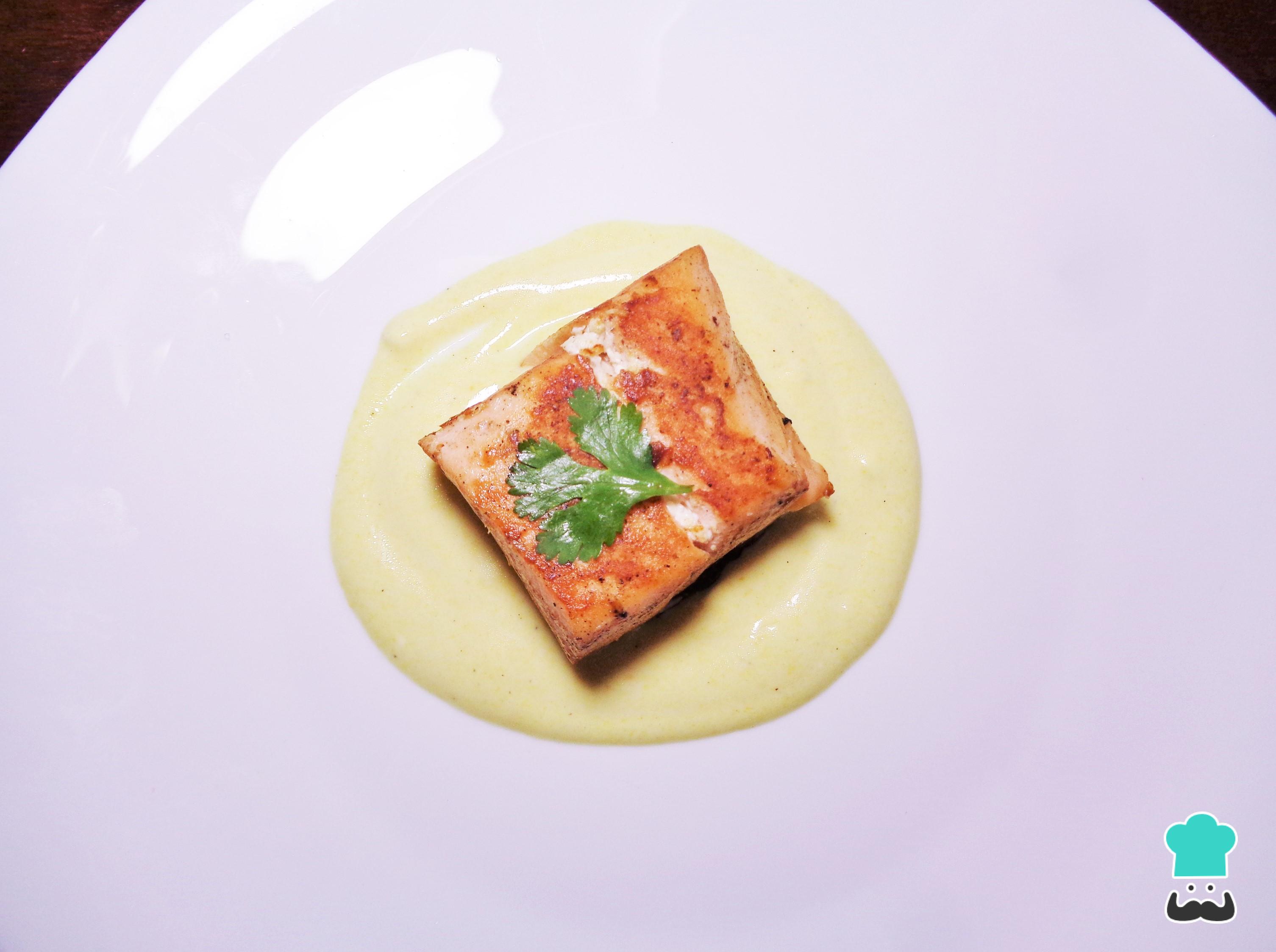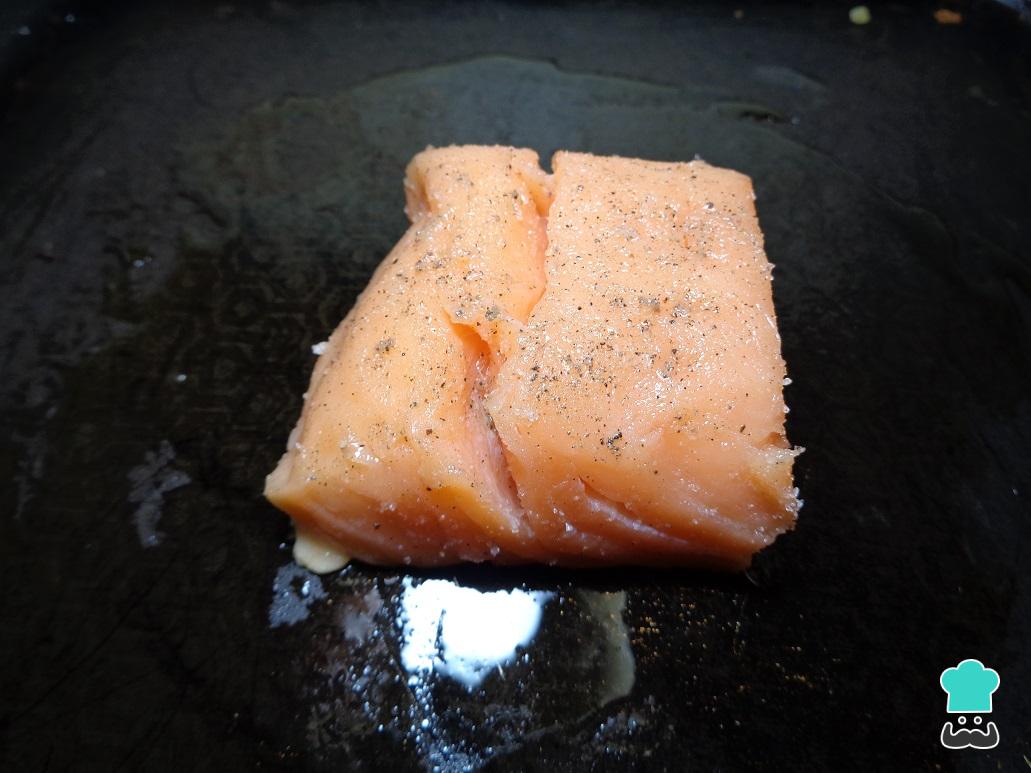 Mientras tanto tomamos nuestros lomos de salmón, los salpimentamos perfectamente y los llevamos a cocinar a la plancha caliente. Dejamos que se cocinen por tres minutos.