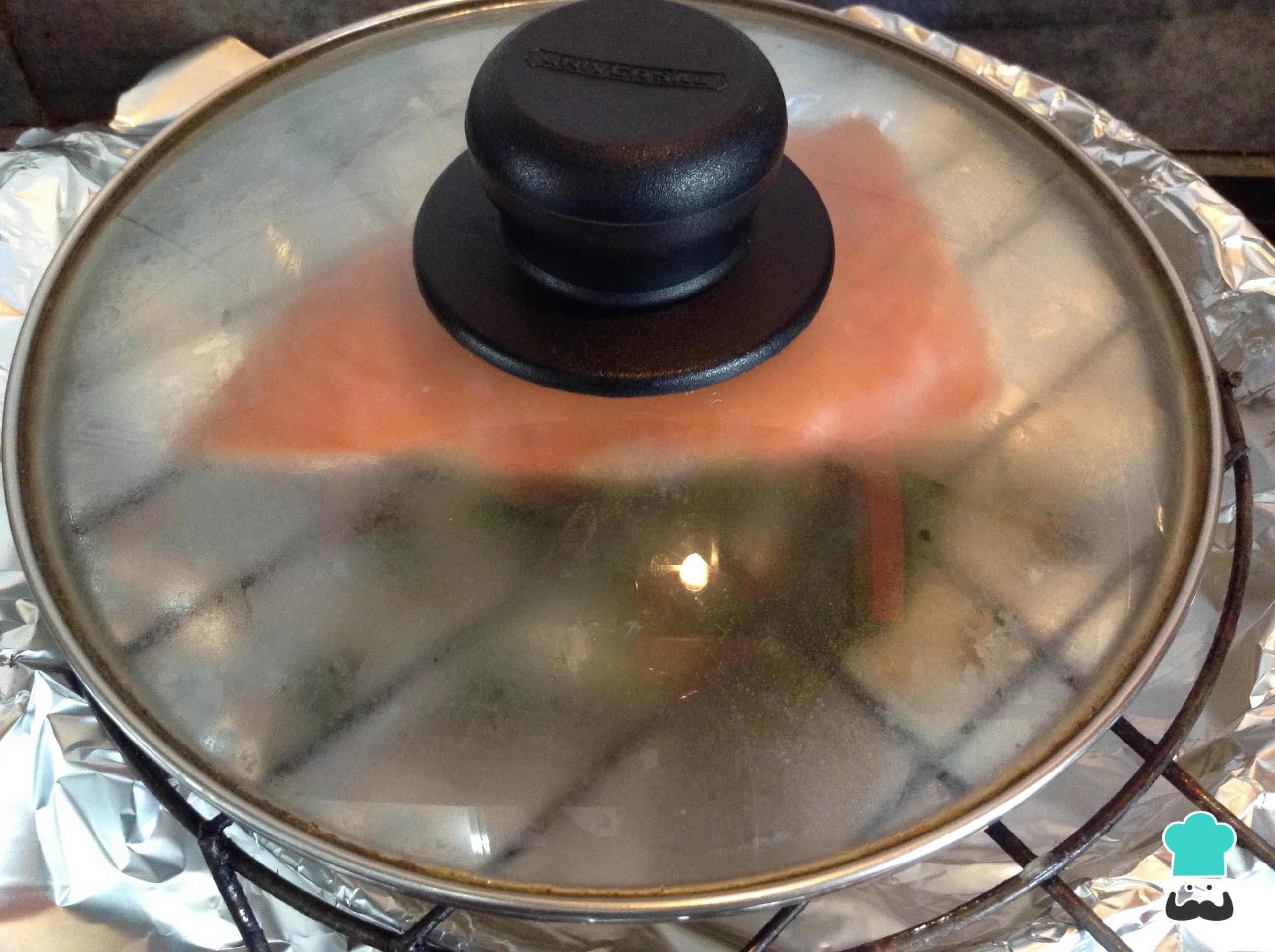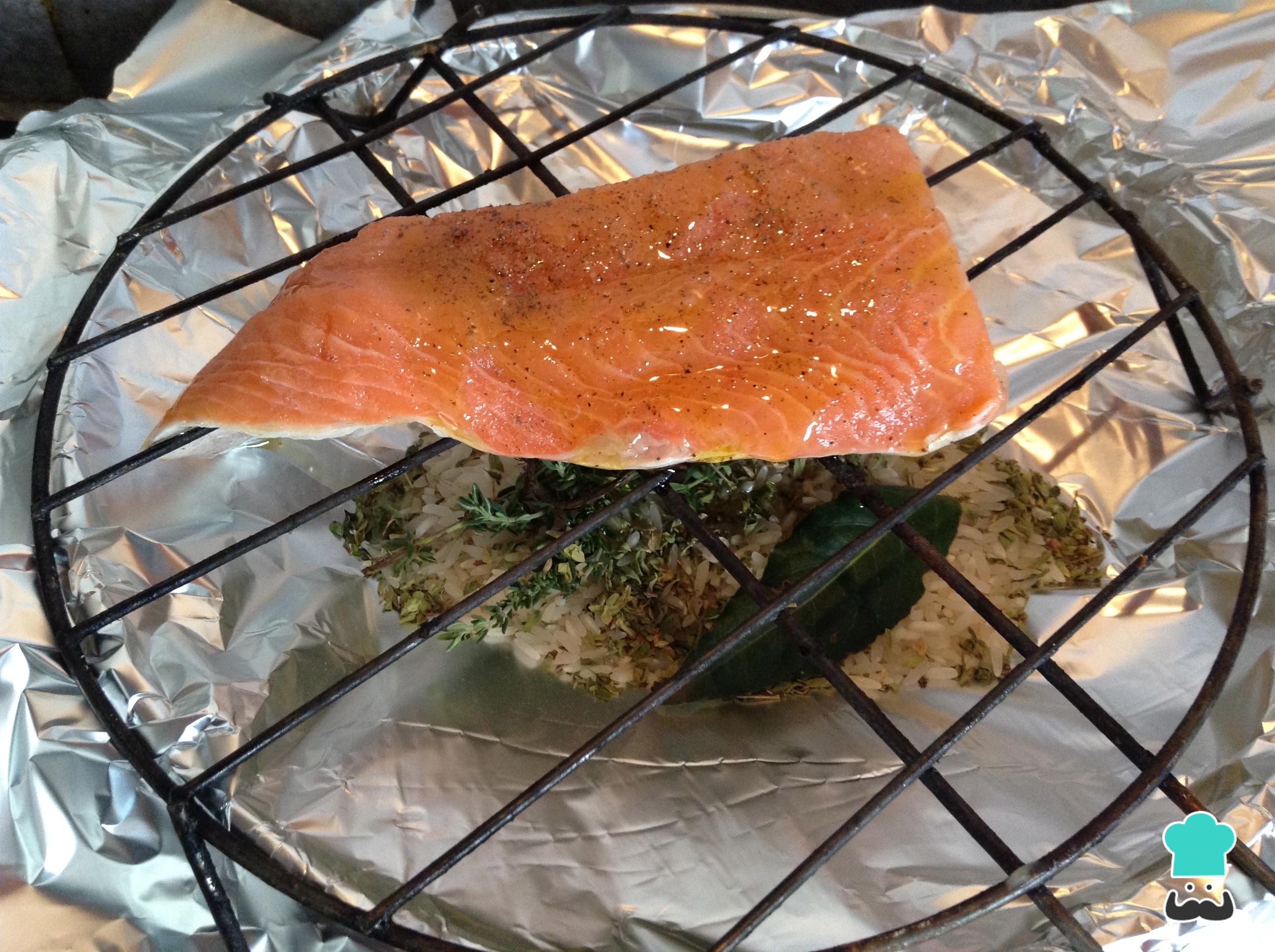 Una vez veamos que el arroz y las hierbas empiezan a soltar humo, tapa la pieza de salmón como se ve en la foto para que el humo cocine toda la carne.