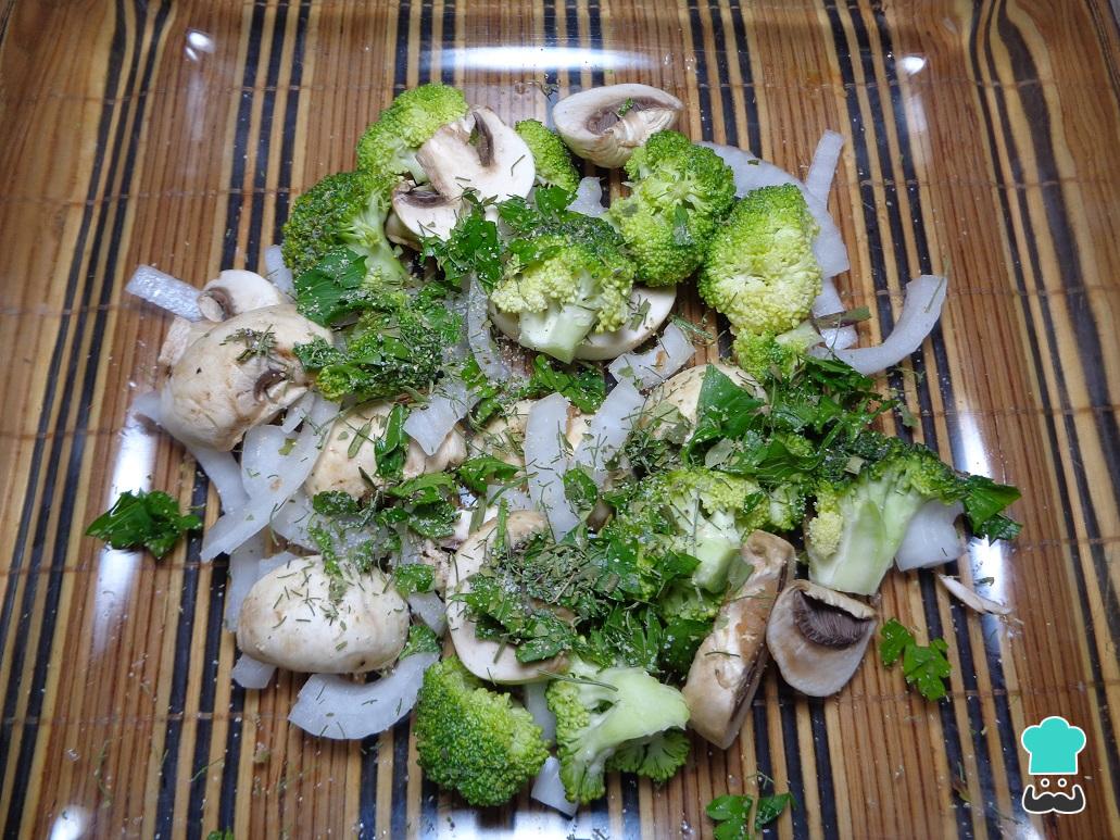 Para comenzar a cocinar nuestro salmón con verduras, tomamos el brócoli, los champiñones y la cebolla, los lavamos y cortamos en pequeños trozos, así como observamos en la siguiente imagen.