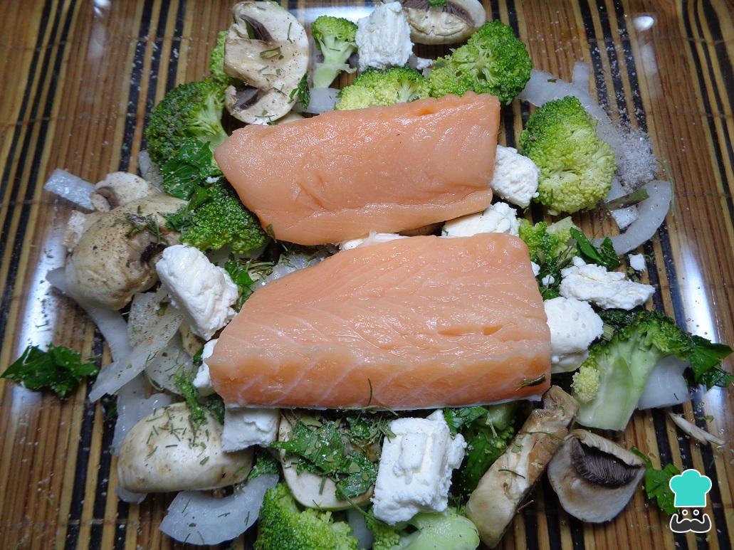 Por último, colocamos el salmón fresco sobre esta mezcla de verduras y especias y añadimos también el queso blanco cortado en cubos. Cuando tengamos esto listo, cocinamos en el microondas a máxima potencia por 9 minutos.