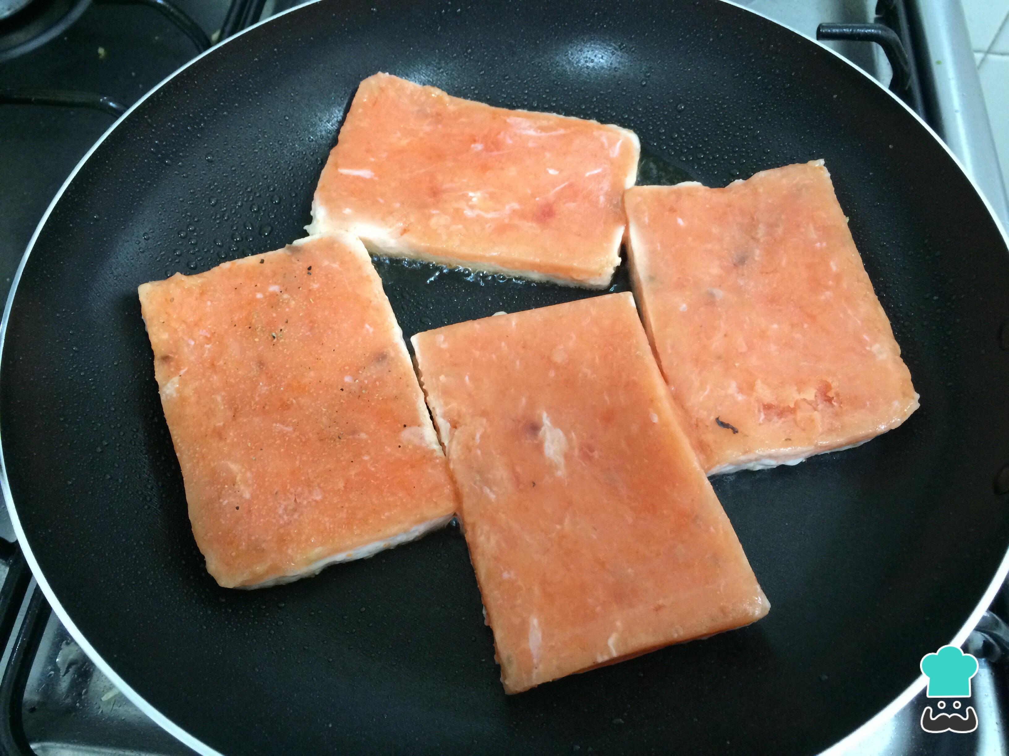 En otra sartén con un poco de aceite, cocinar los filetes de salmón previamente salpimentados por ambos lados durante 3 minutos.