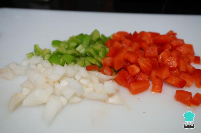 Pica las verduras (la cebolla, el pimiento rojo y el pimiento verde) en trozos muy pequeños.