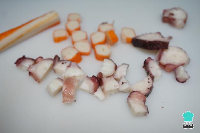 Corta en trozos pequeños el pulpo y los palitos de cangrejo. Pela las gambas y, según tu gusto, córtalas o déjalas enteras.