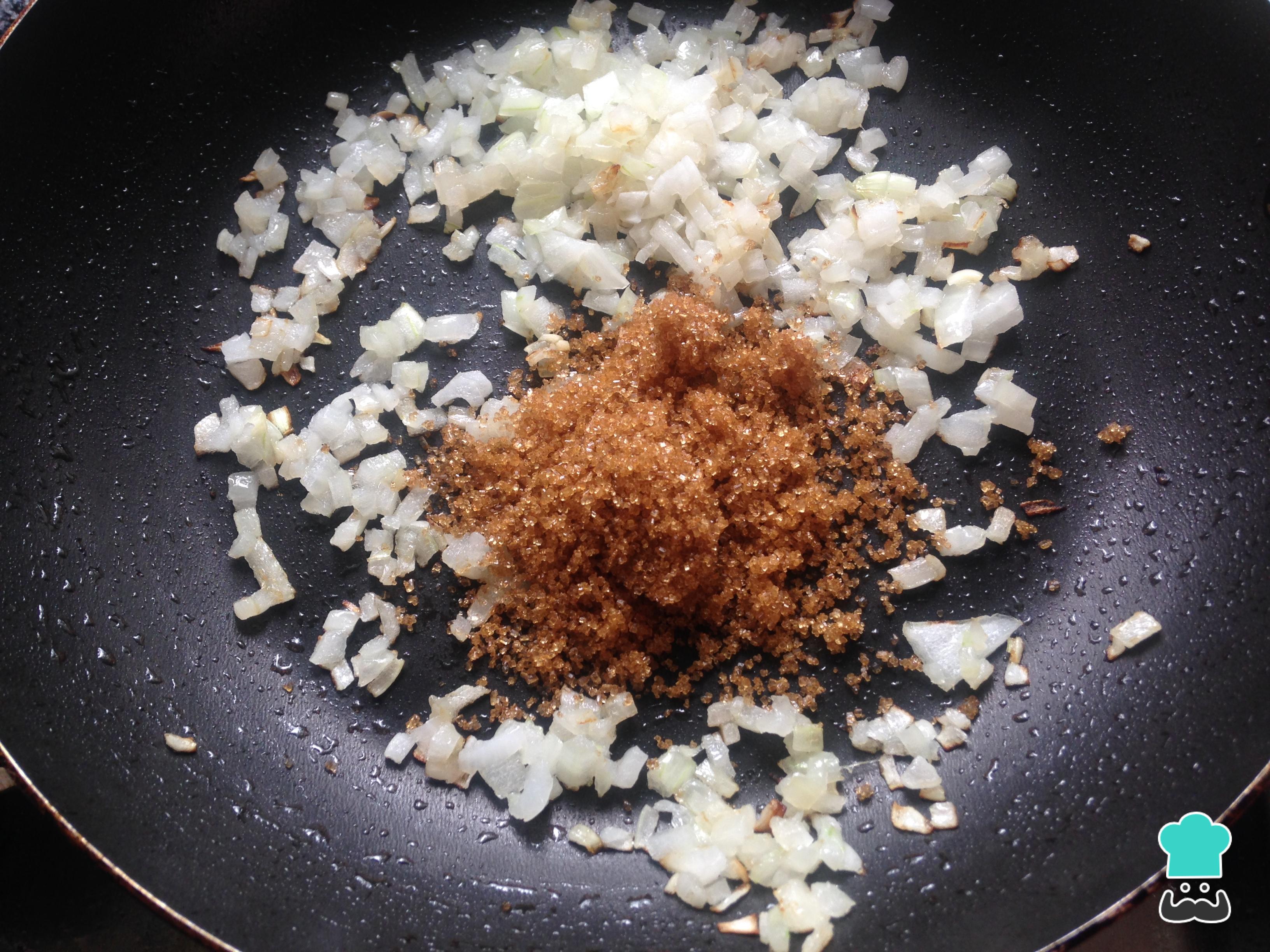 En una sartén con un poco de aceite de oliva saltea la cebolla cortada en cuadros junto con el ajo. Cuando estén dorados agrega el azúcar moreno y cocina a fuego bajo hasta que veas que la cebolla carameliza. Para más detalles, consulta la receta paso a paso de cebolla caramelizada.