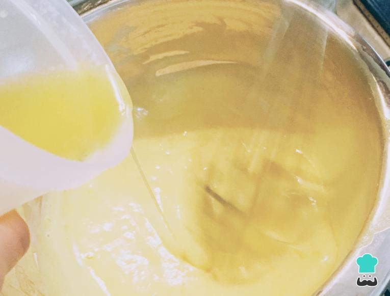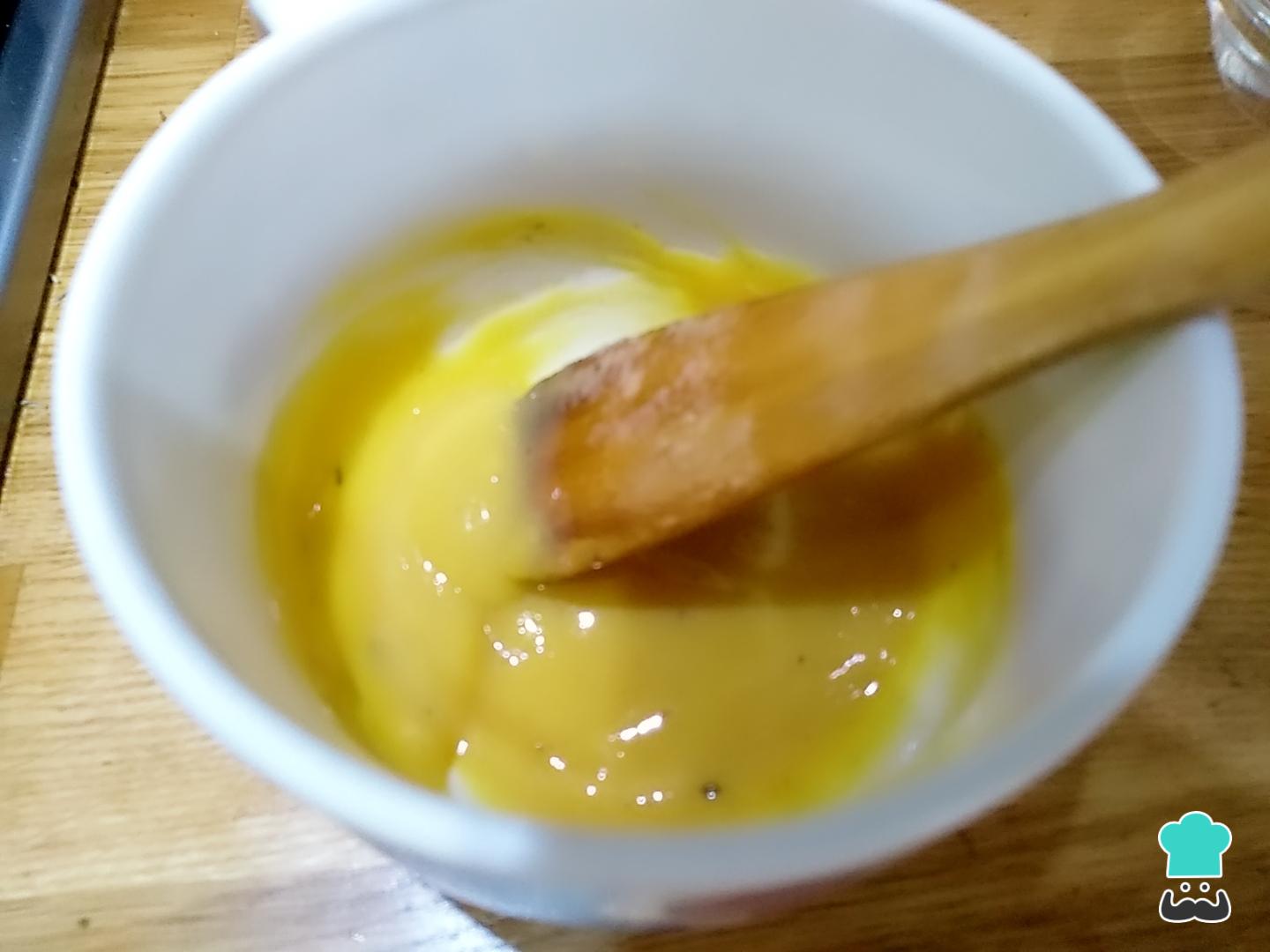 Vierte la mantequilla sin dejar de remover, verás que se va formando una salsa bearnesa cremosa y brillante de color amarillo. Cuando la tengas formada, no mezcles más, puesto que corres el riesgo de que se vuelva líquida de nuevo y, por tanto, se corte.