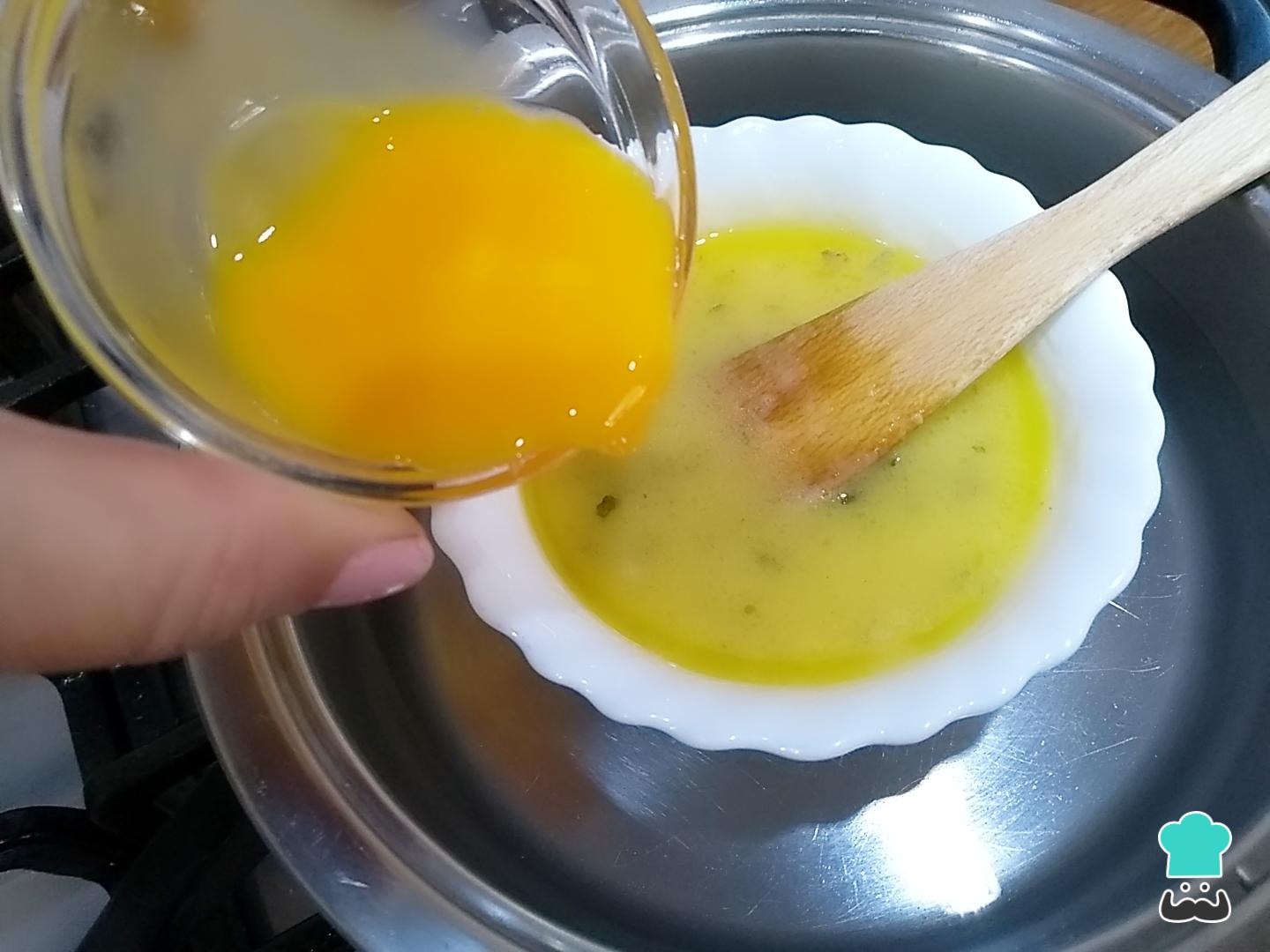 En baño María, pon un cuenco con el caldo que reservaste y, lentamente, vierte las yemas sin dejar de mezclar para que los ingredientes se liguen correctamente. No dejes que las yemas se cuajen o la salsa se echará a perder. Si ves que podrían cuajarse, saca el recipiente del baño María y continúa ligando por unos 4 minutos más.