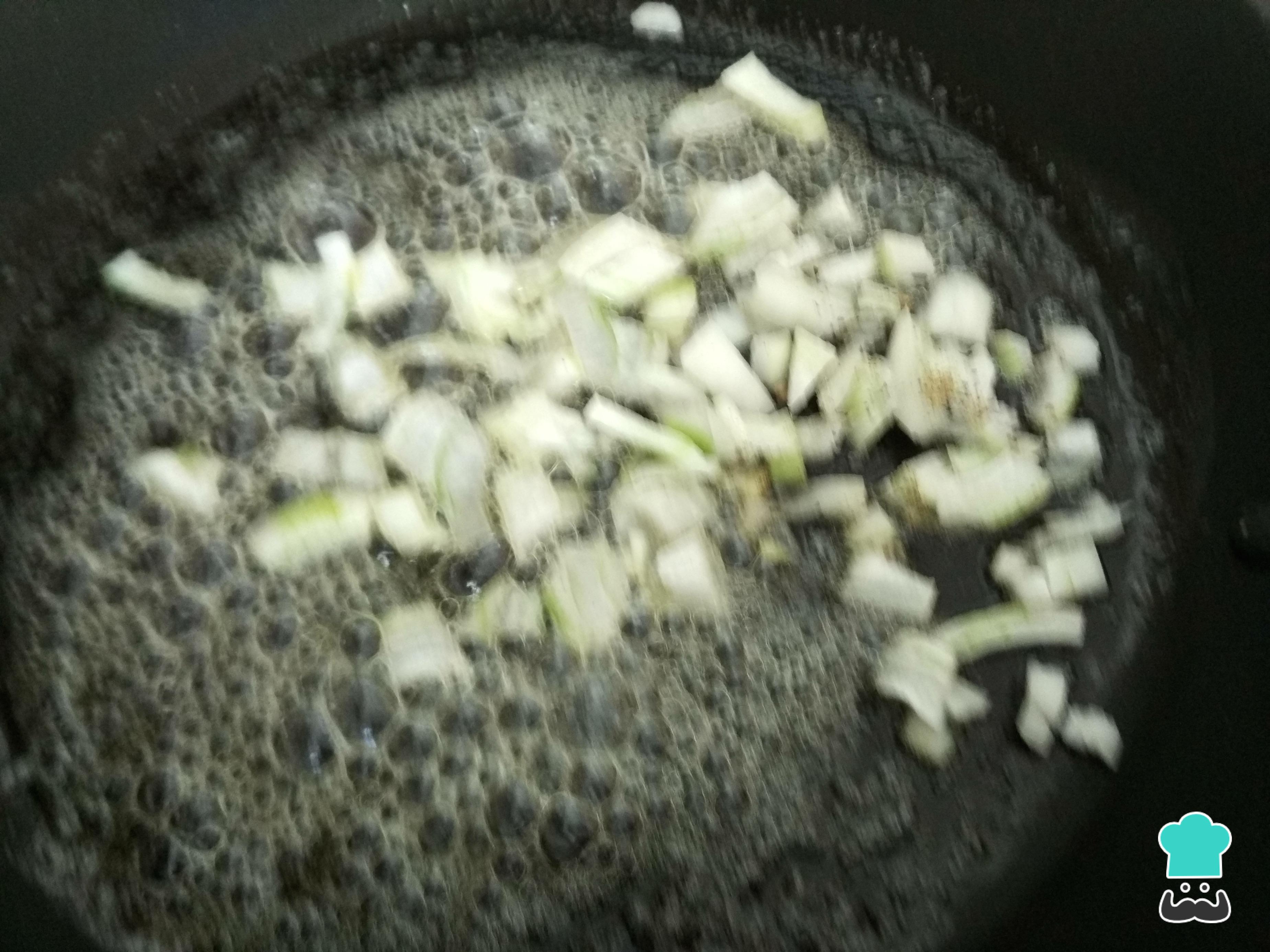 En una sartén, derretimos la mantequilla y agregamos la cebolleta picada de forma fina. Dejamos que se cocine hasta que empiece a estar transparente.