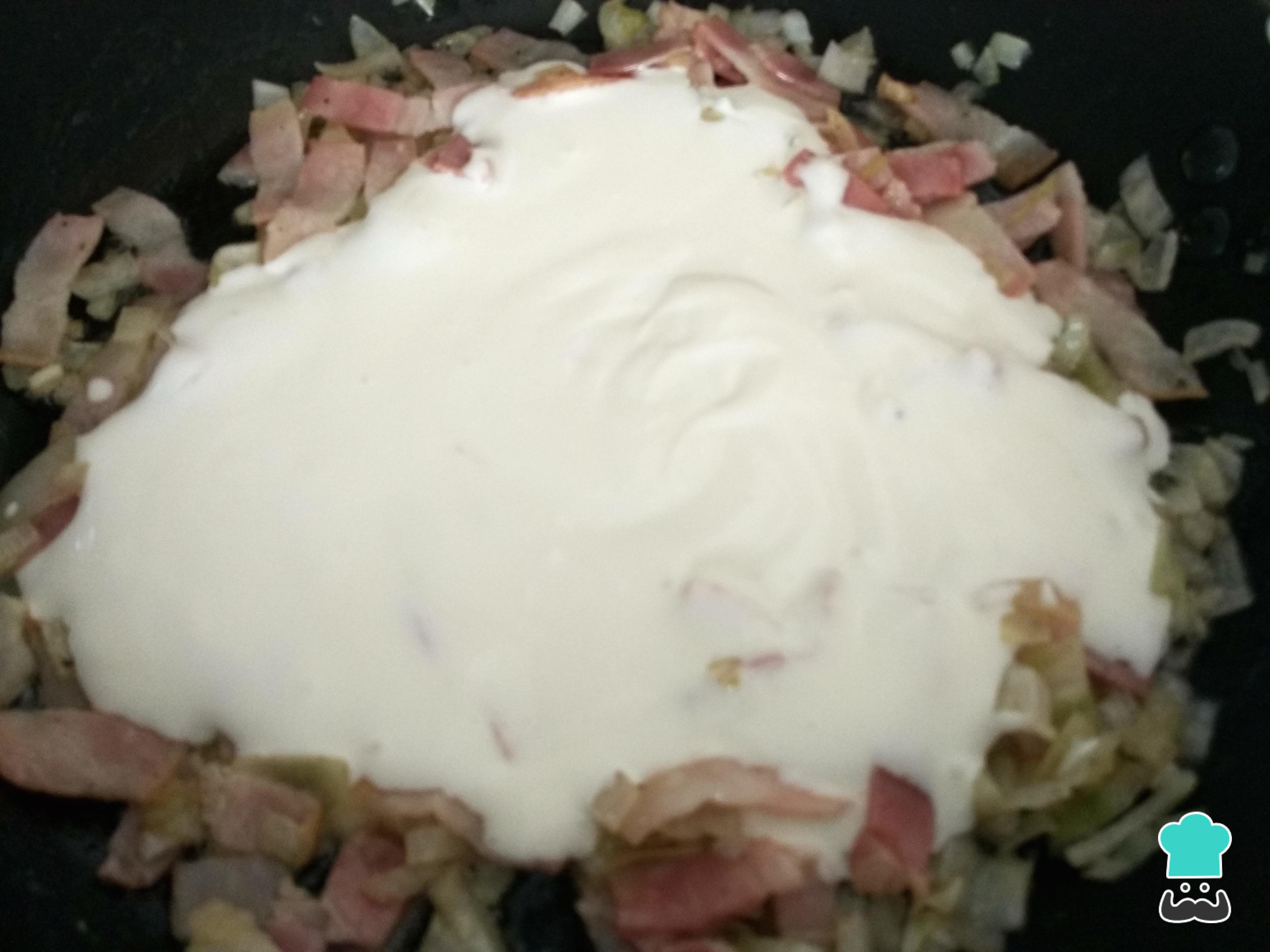 Otra forma de hacer la salsa carbonara fácil sería mezclar el huevo con la nata y el queso en un bol, y añadirlo al sofrito de cebolla y bacon.