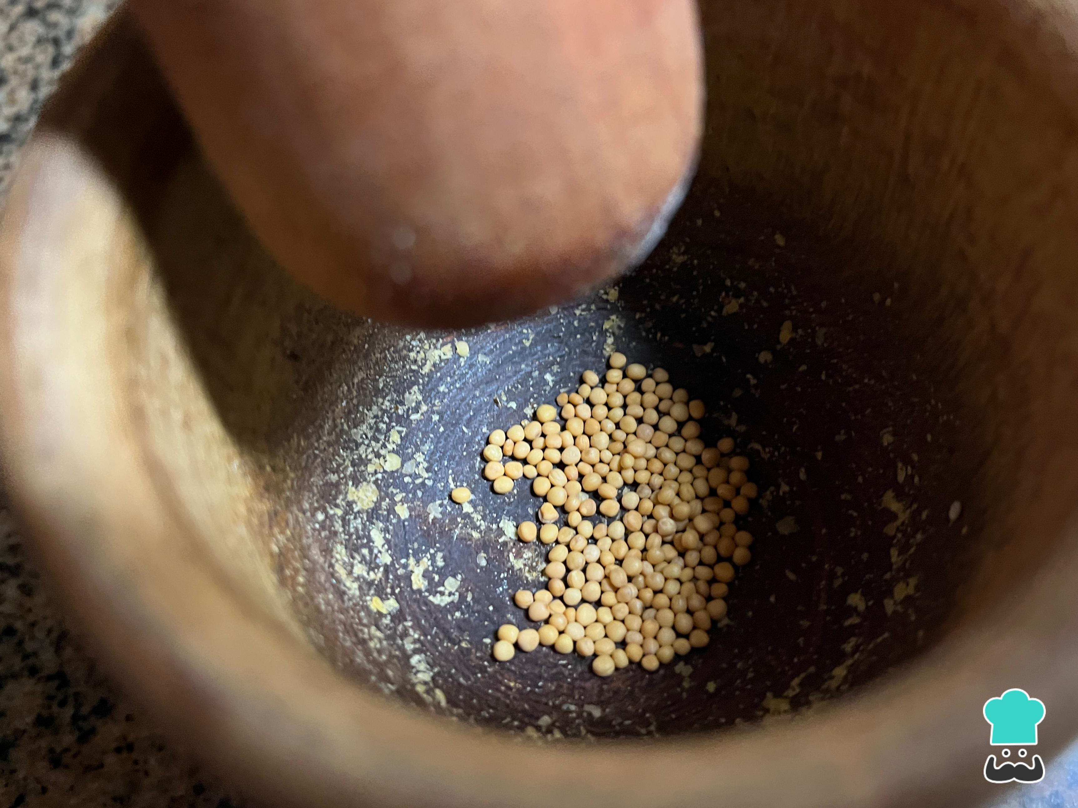 Por otro lado, lleva los granos de mostaza a un mortero para pisar y mezclar con la preparación anterior. Si no tienes mostaza en grano, puedes utilizar la mostaza comercial.