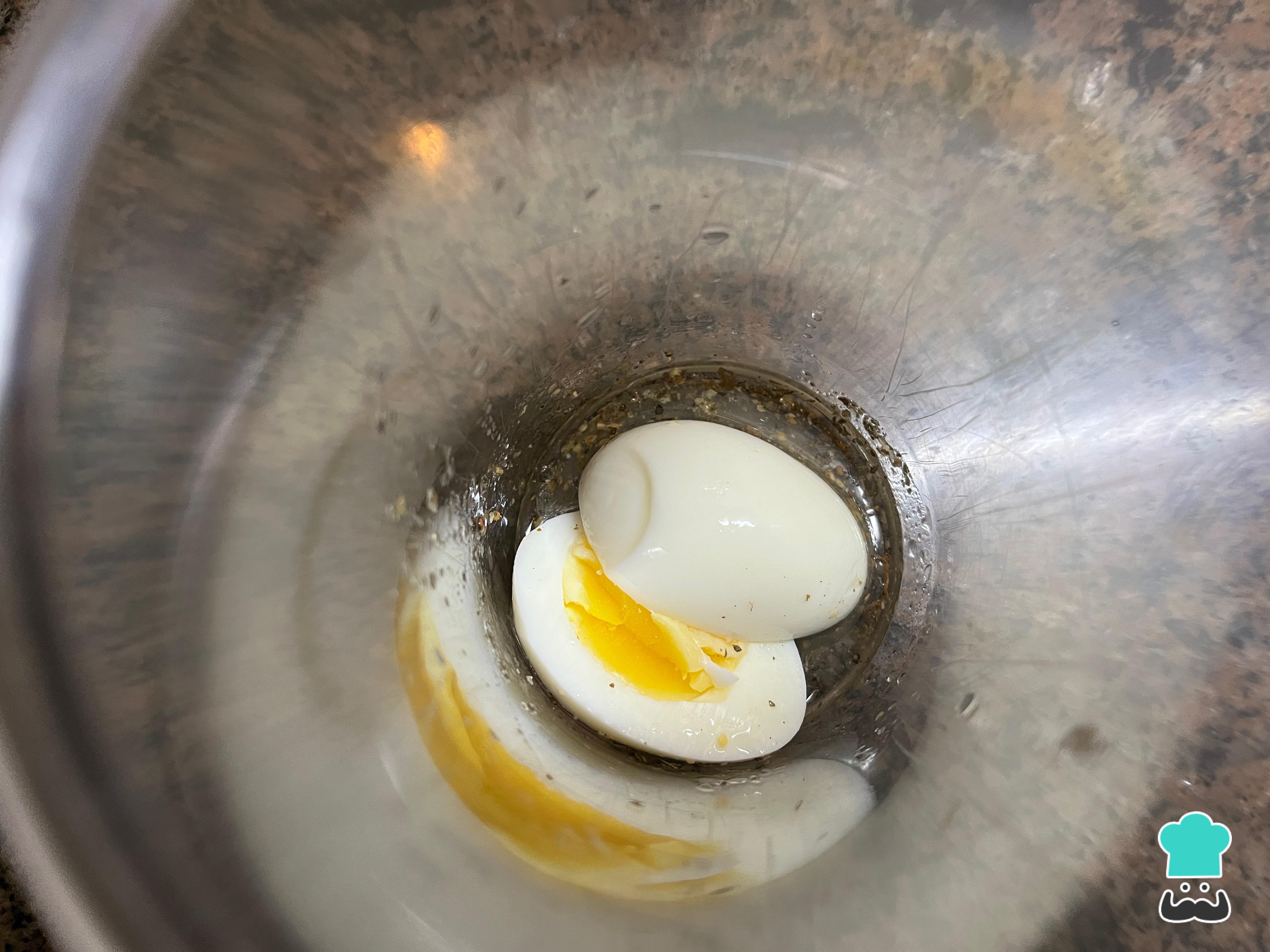 Cuando hayan pasado los 12 minutos de cocción del huevo, pélalo cuidadosamente para no quemarte y llévalo al recipiente con el jugo de limón, el aceite y los condimentos.
