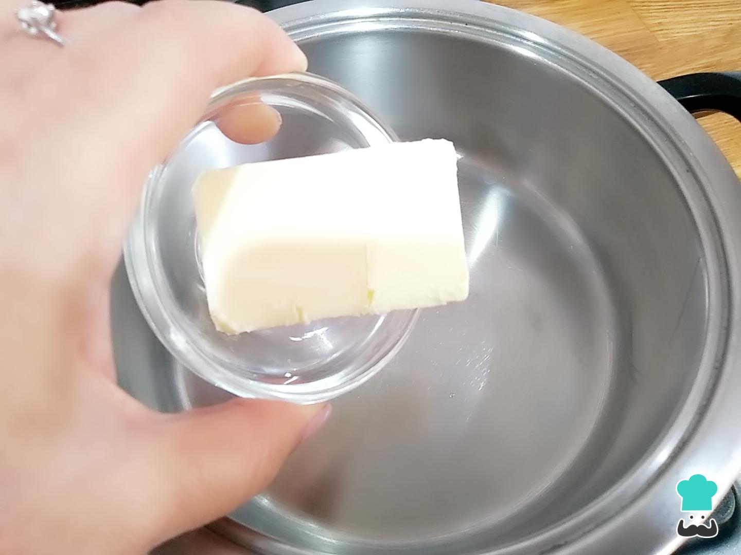 Coloca la mantequilla en un cazo y calienta al fuego medio, removiendo constantemente para fundirla lo mínimo. Si es necesario, retira el cazo del fuego.