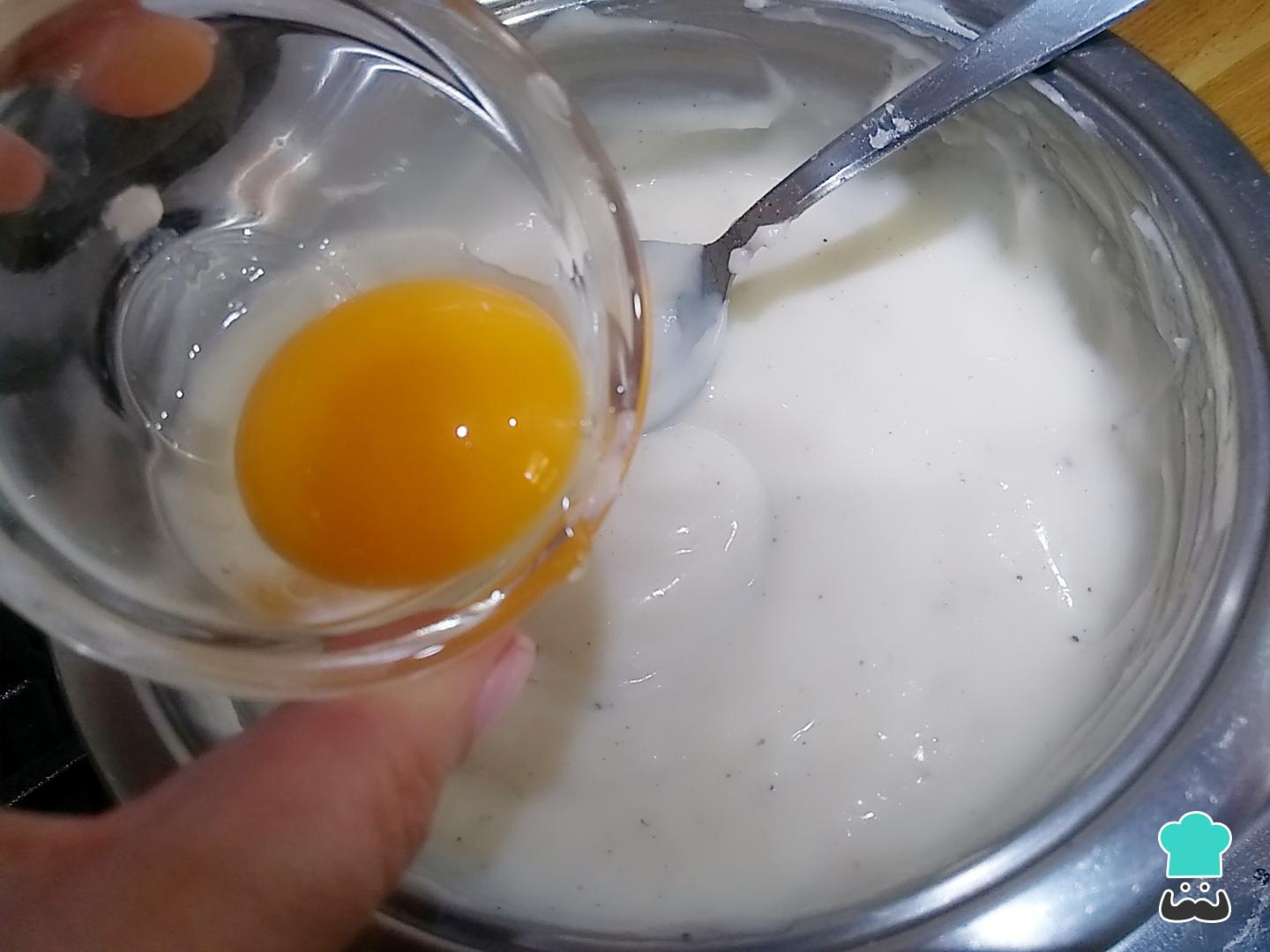 Añade la yema de huevo cuando la salsa esté tibia e integra rápidamente para que evitar que la yema cuaje y estropee la salsa.