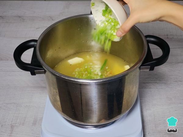 Antes de finalizar, incorpora cebolla larga junto con cilantro fresco ambos finamente picados. Remueve bien.