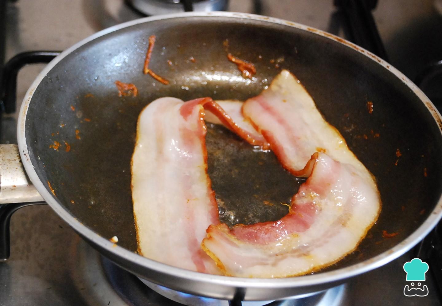 En la misma sartén cocina las tiras de bacon hasta que estén al gusto. Puedes hacerlas hasta que se doren o dejarlas más hechas para que estén bien crocantes. Reserva sobre papel absorbente para eliminar el exceso de grasa.