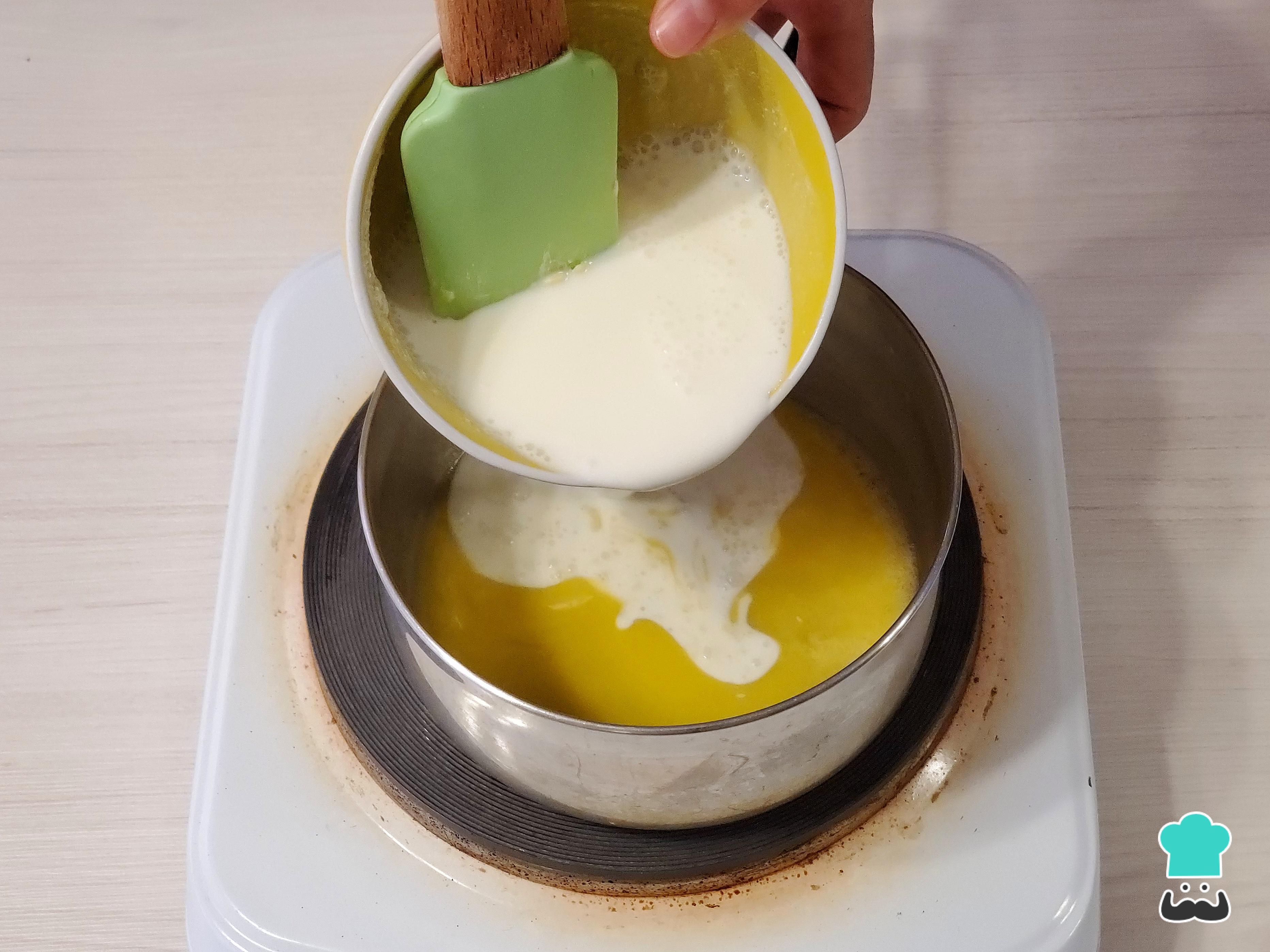 Empieza derritiendo la mantequilla en una olla, hazlo a fuego bajo para que se derrita lentamente. Luego, vierte inmediatamente la leche y solo calienta hasta entibiar.