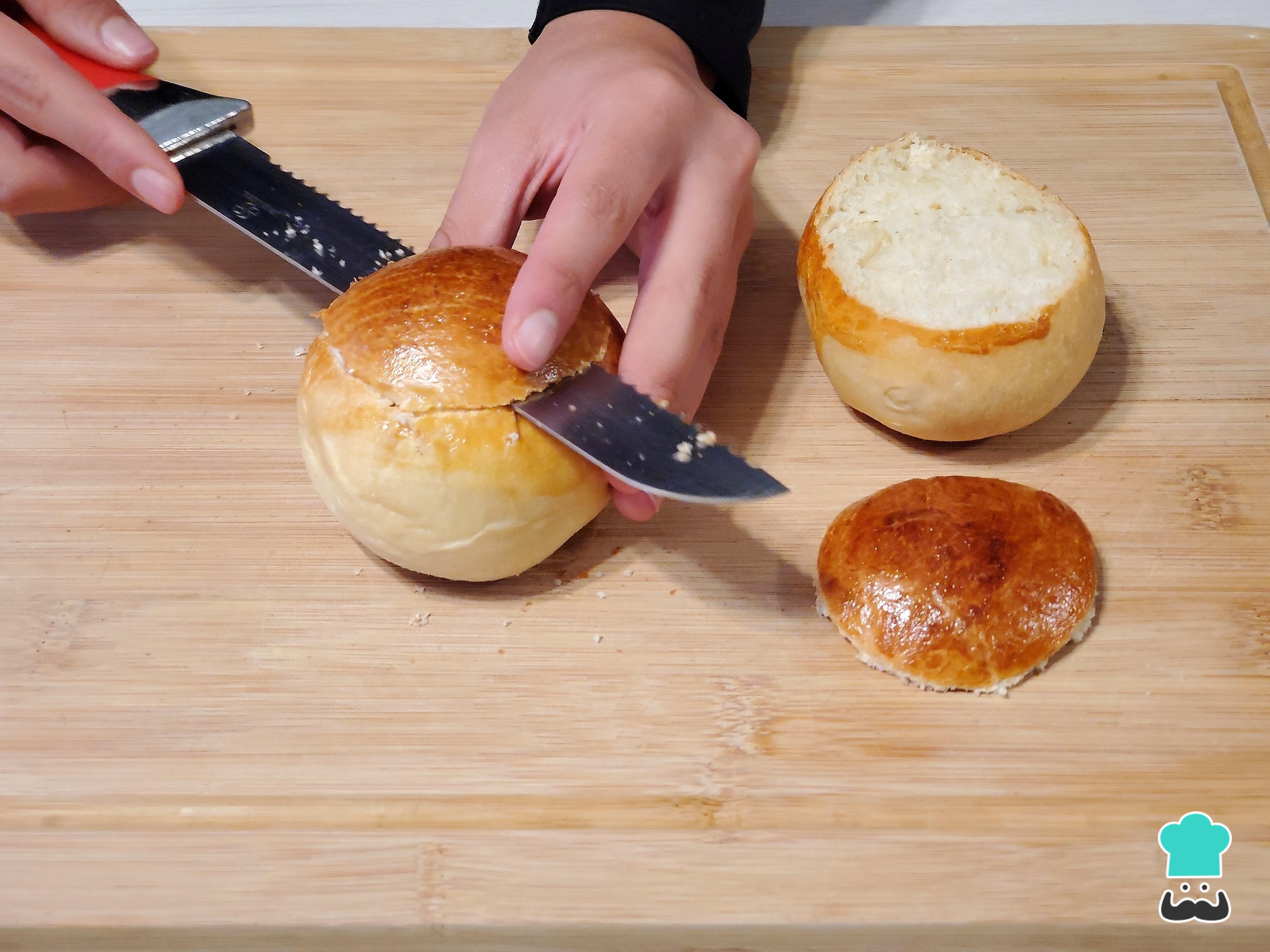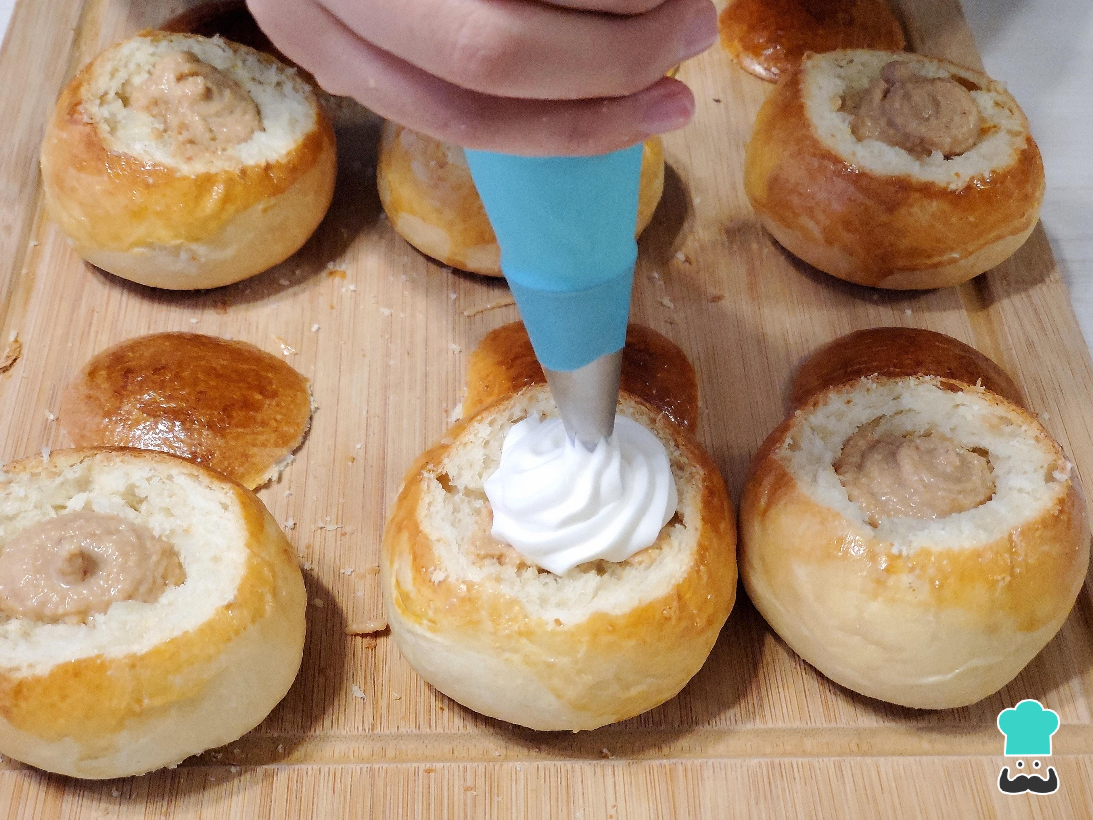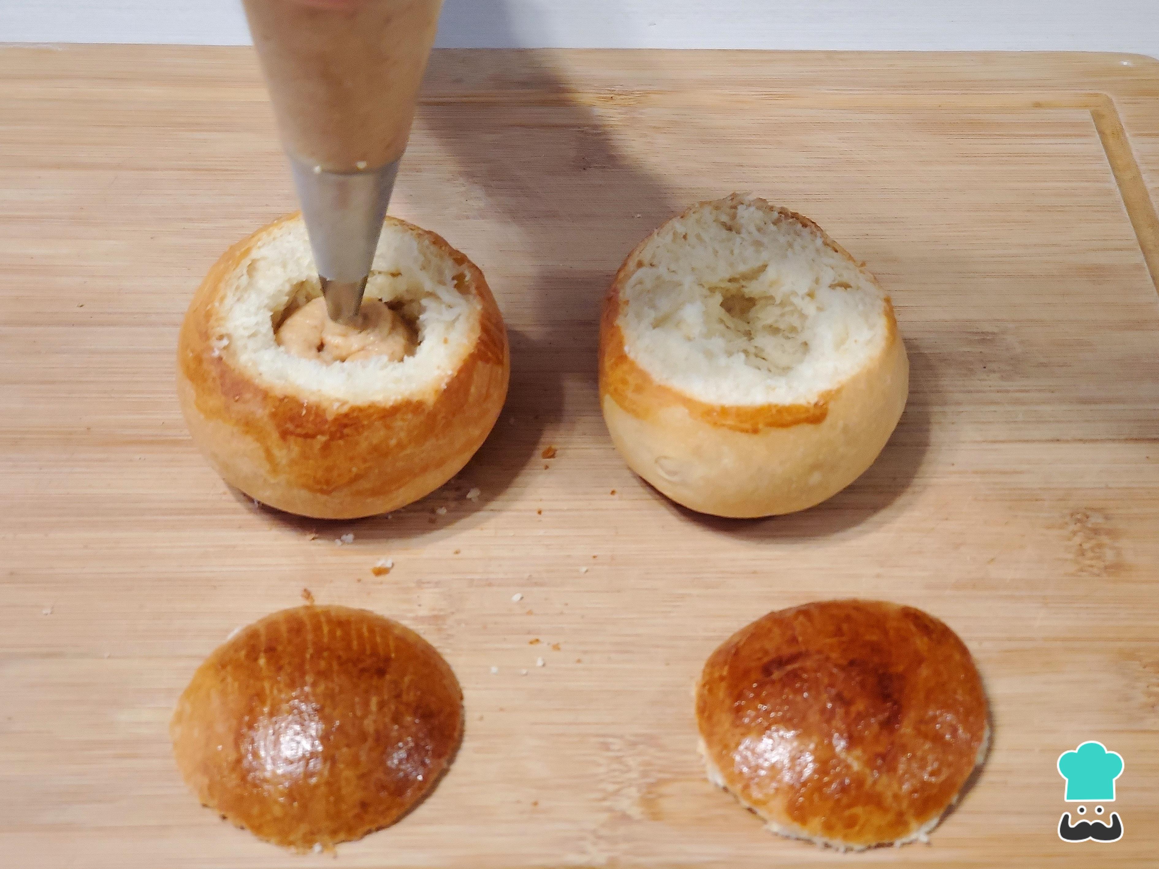 Retira un poco de la miga del bollo y ahí vierte la crema de almendras.