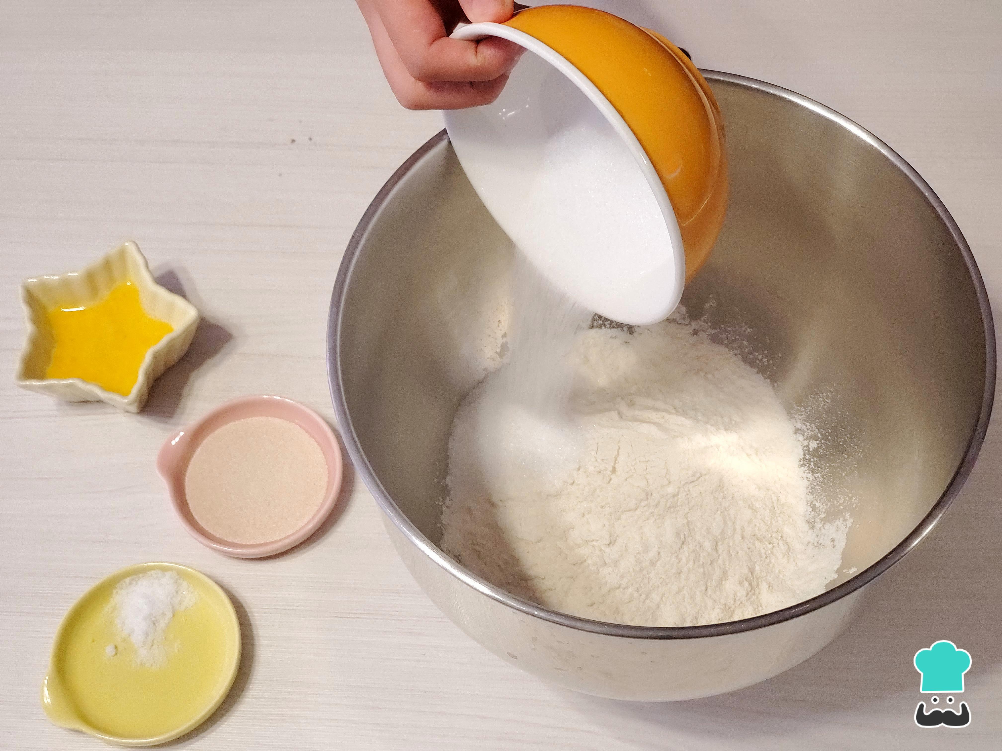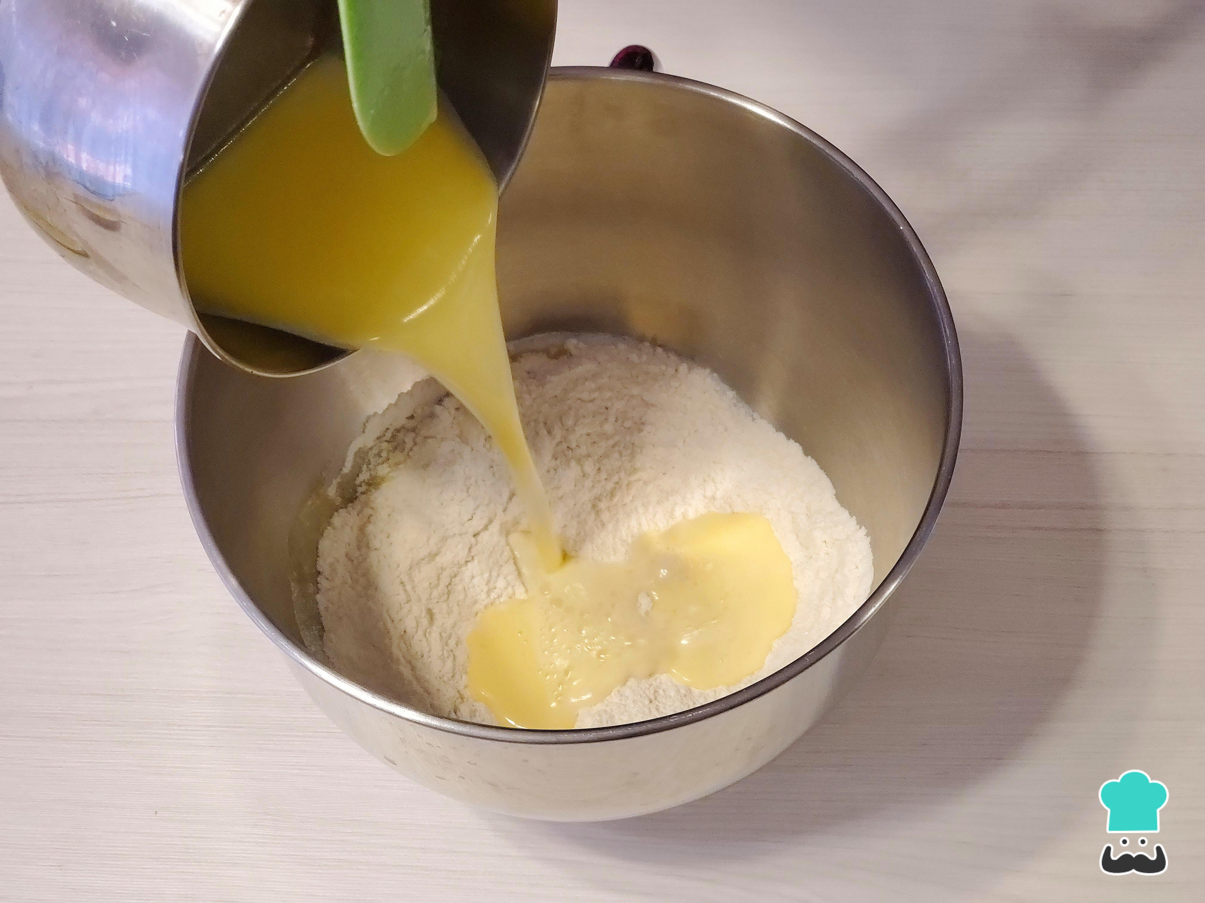 Vierte la leche tibia encima y empieza a amasar utilizando el accesorio de gancho.