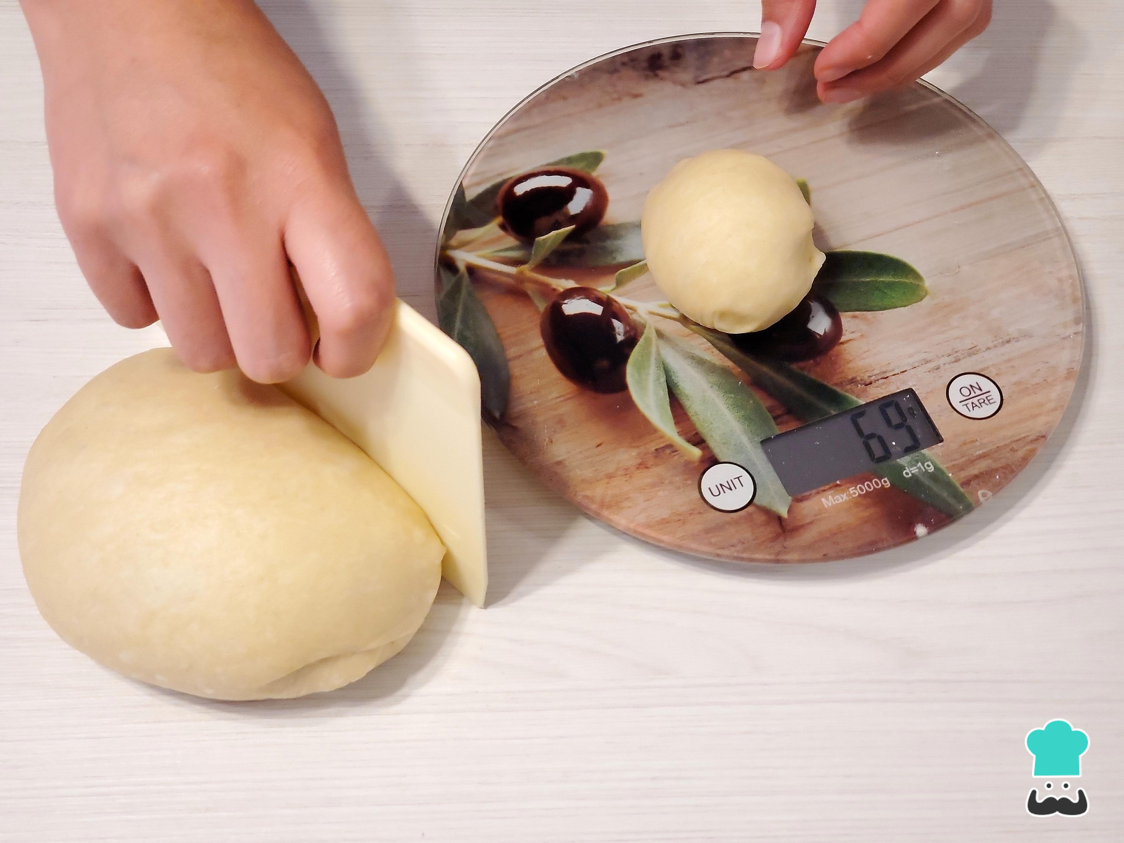 Cumplido el tiempo de reposo, desinfla la masa, vuelve a bolearla y divídela en bollos de 70 a 100 gramos aproximadamente.