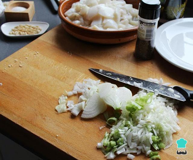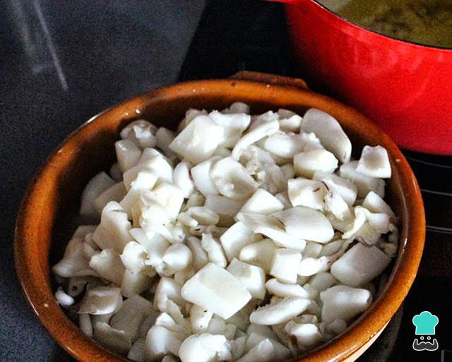 Ahora sí, ¡empezamos! Limpiamos bien la sepia y la troceamos en cuadros. Luego, lavamos las cebolletas y las cortamos en aros finos, incluimos la parte verde.