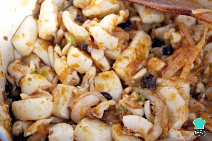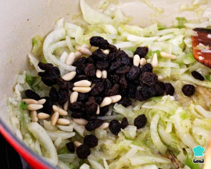 Ahora, añadimos el aceite de oliva para pochar la cebolleta. Una vez pochada, incorporamos la sobrasada, las pasas y los piñones.