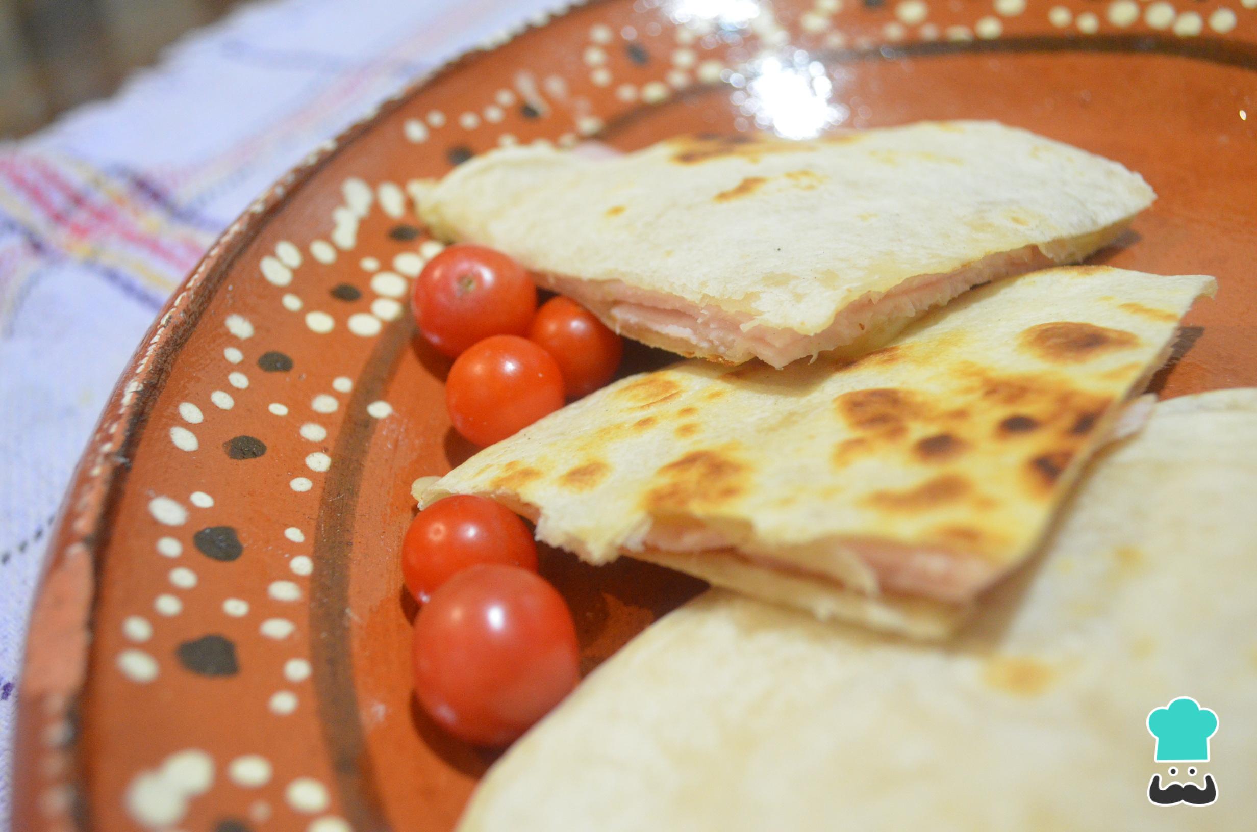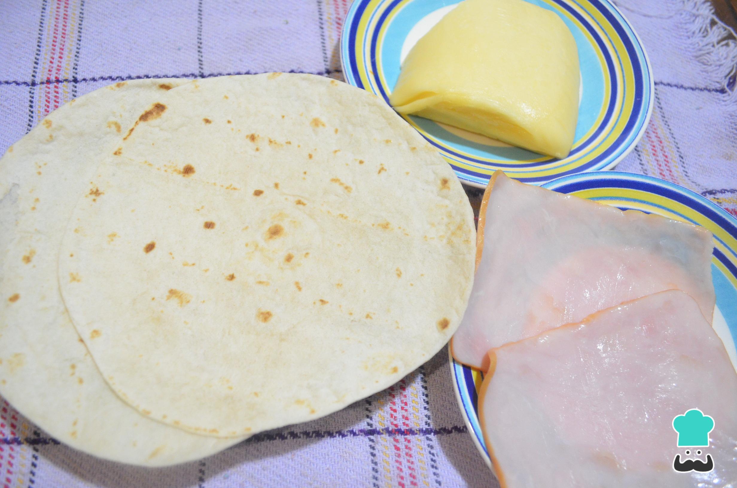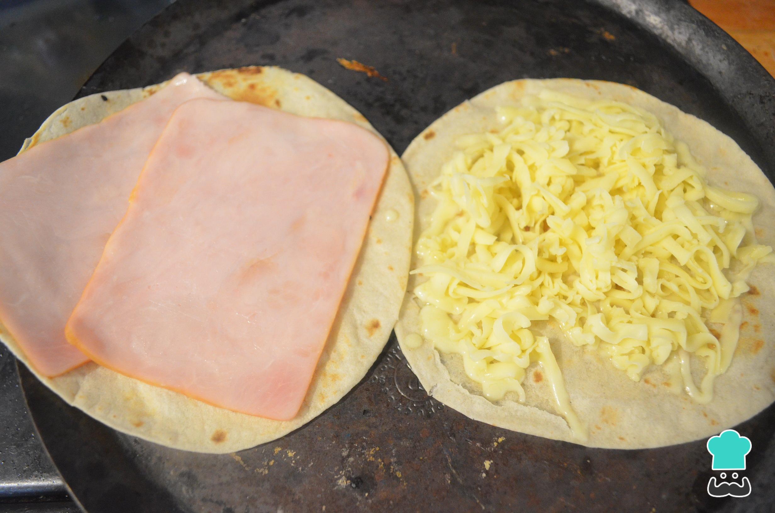 Una vez que las tortillas de harina hayan tomado un poco de color, colocamos una porción de jamón y una porción de queso en cada tortilla.