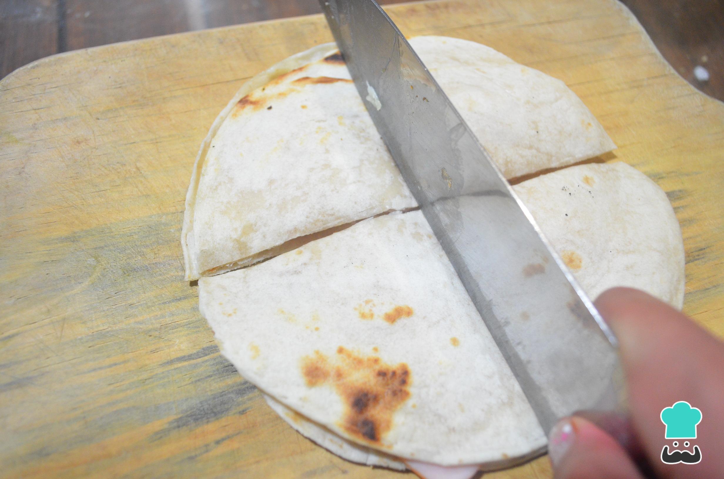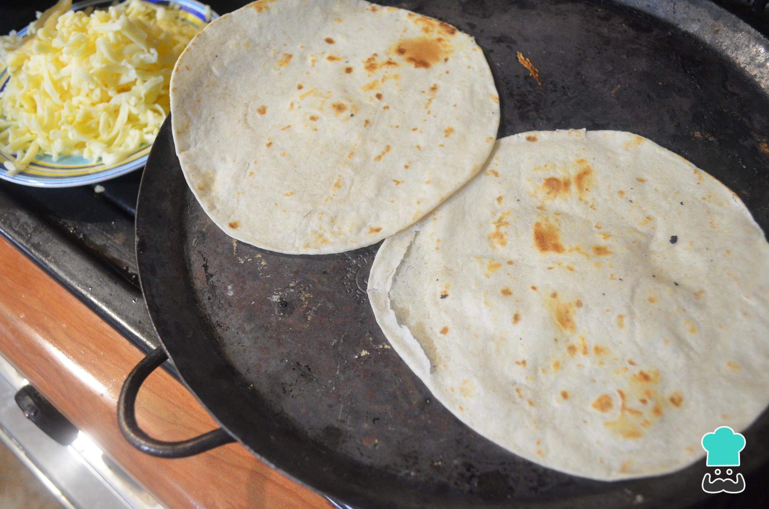 Se cubre cada tortilla con la otra encima y se calienta por ambos lados hasta que el queso se haya derretido. Retiramos del comal y todavía calientes cortamos nuestras sincronizadasen cuatro partes.